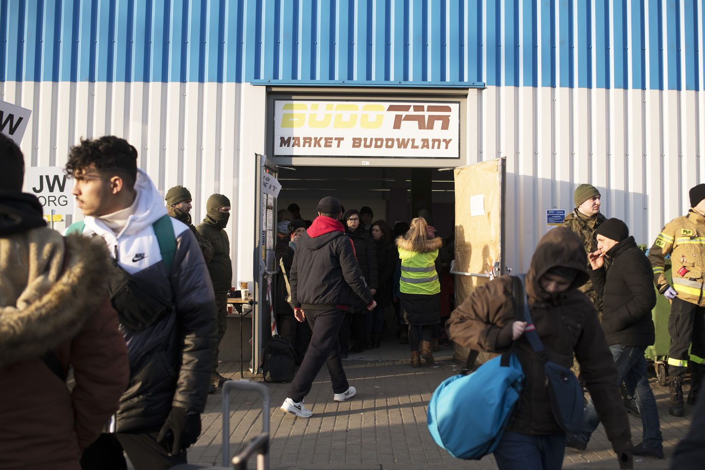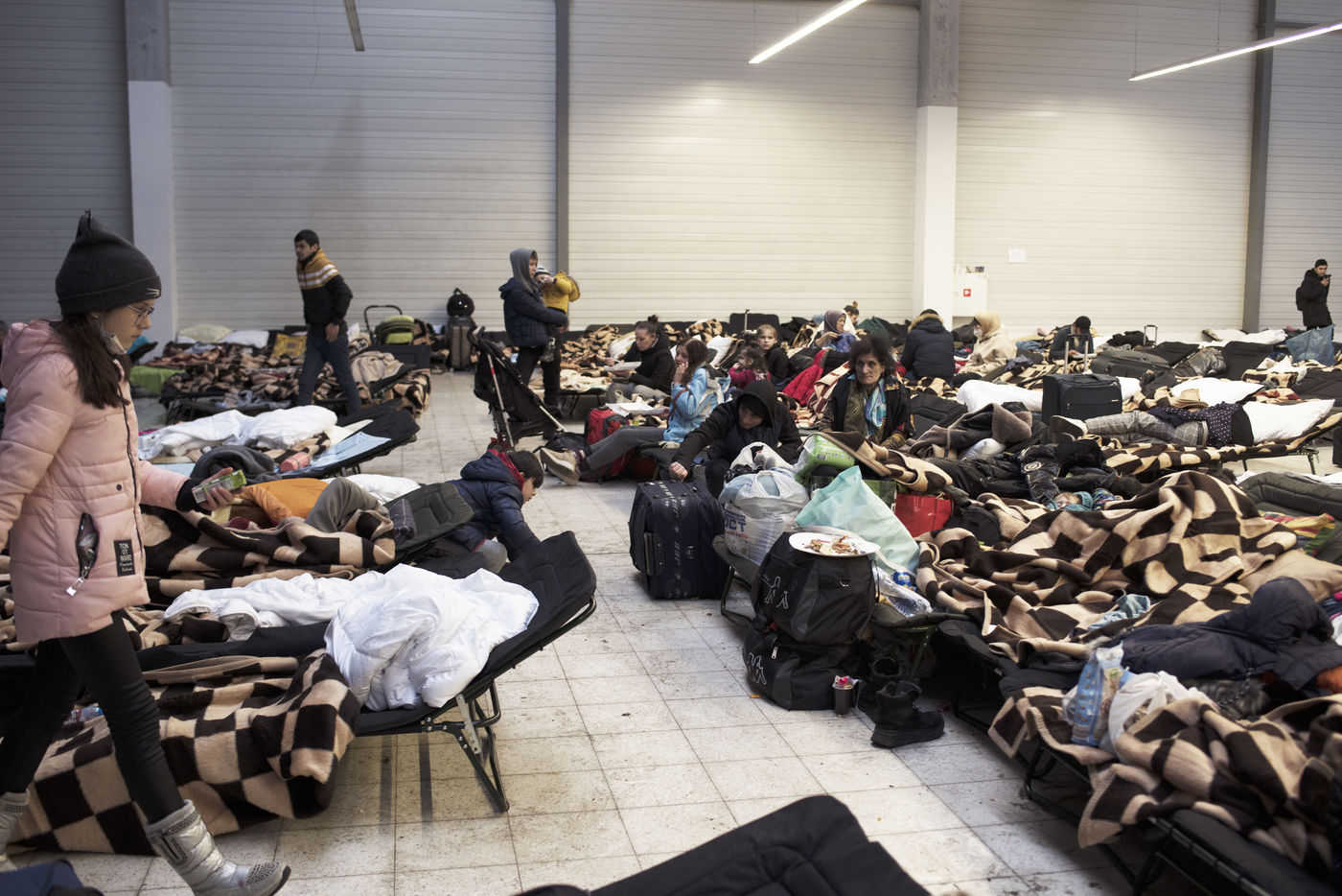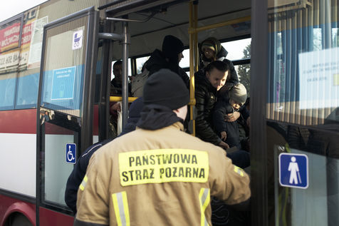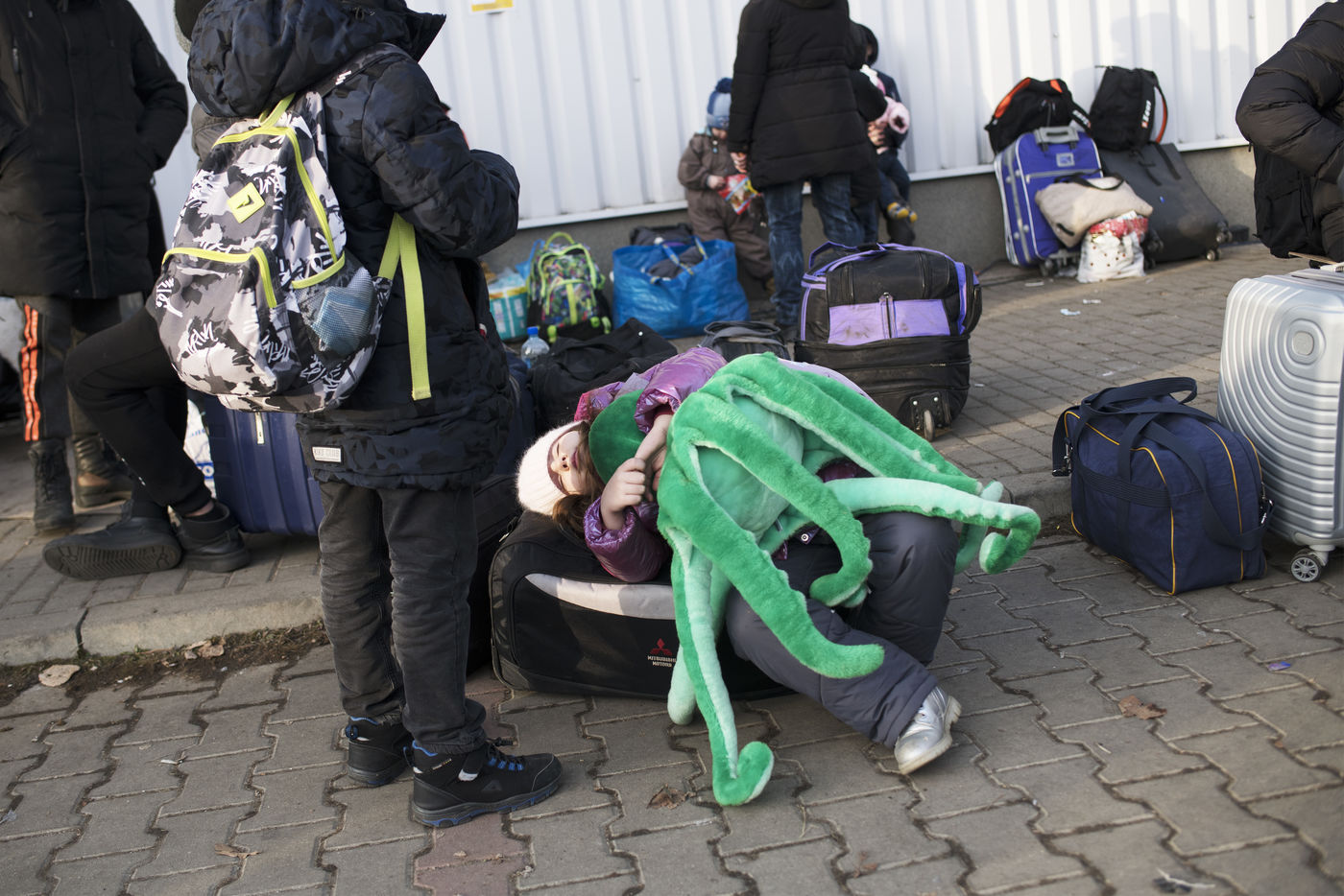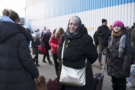 Ukrainian refugees waiting to leave Mlyny after crossing the border between Ukraine and Poland