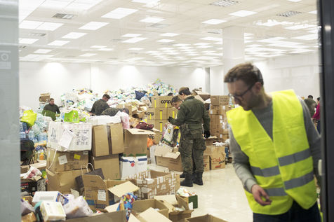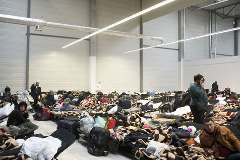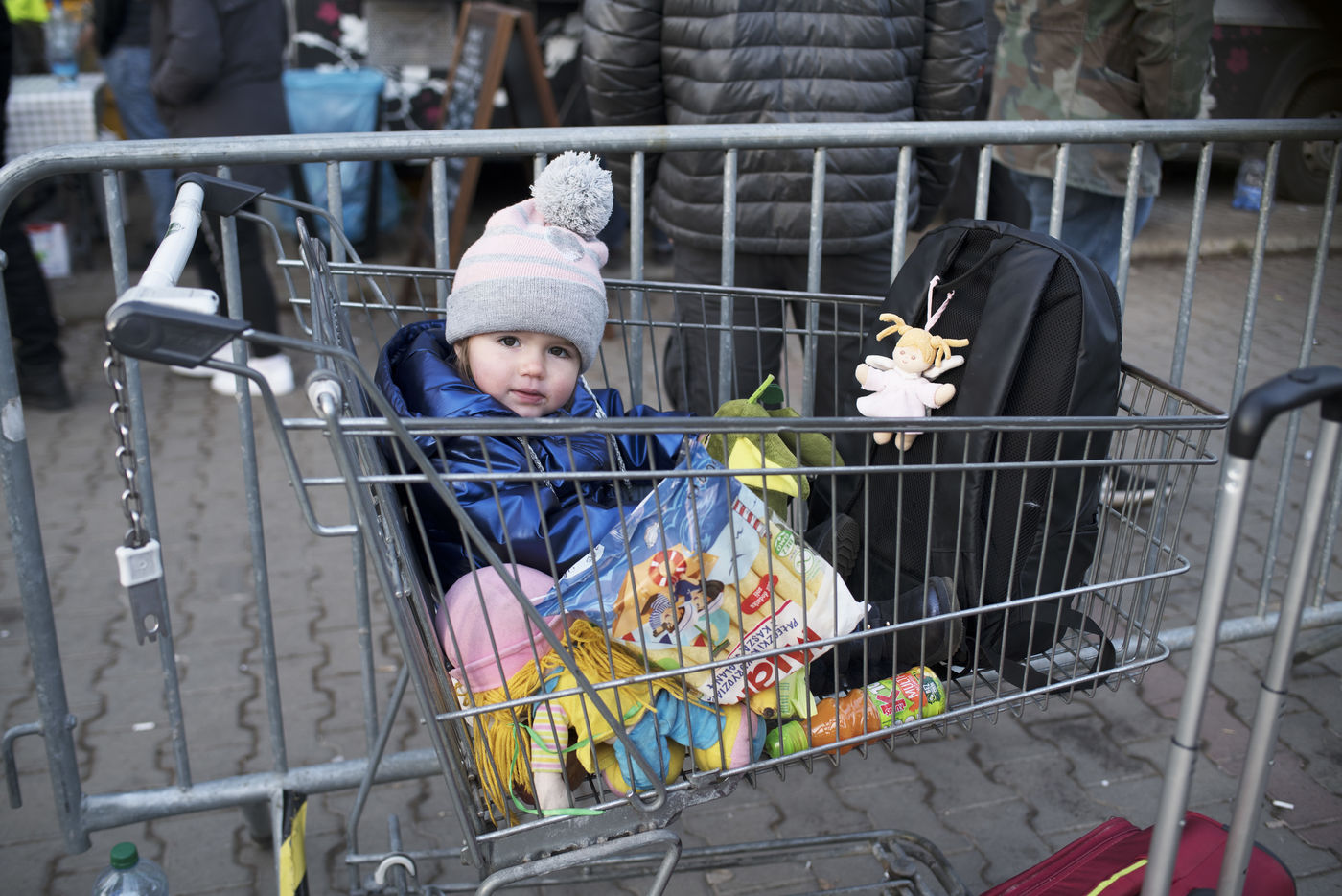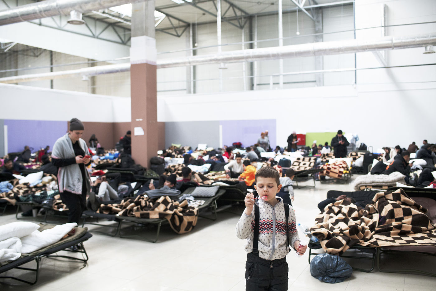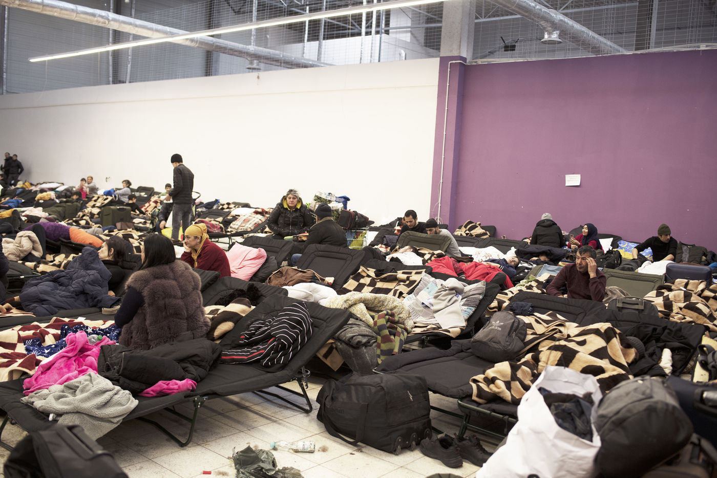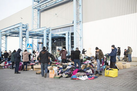 Ukrainian refugees waiting to leave Mlyny after crossing the border between Ukraine and Poland