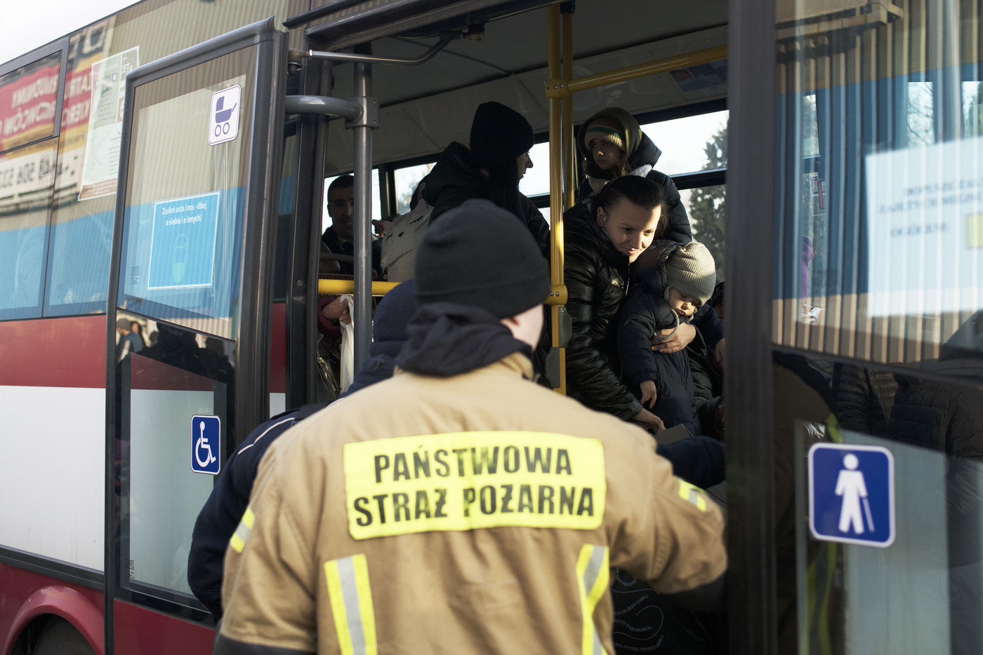 Ukrainian refugees wait for transportation to leave Mlyny shortly after crossing the border between Ukraine and Poland. March 3, 2022.