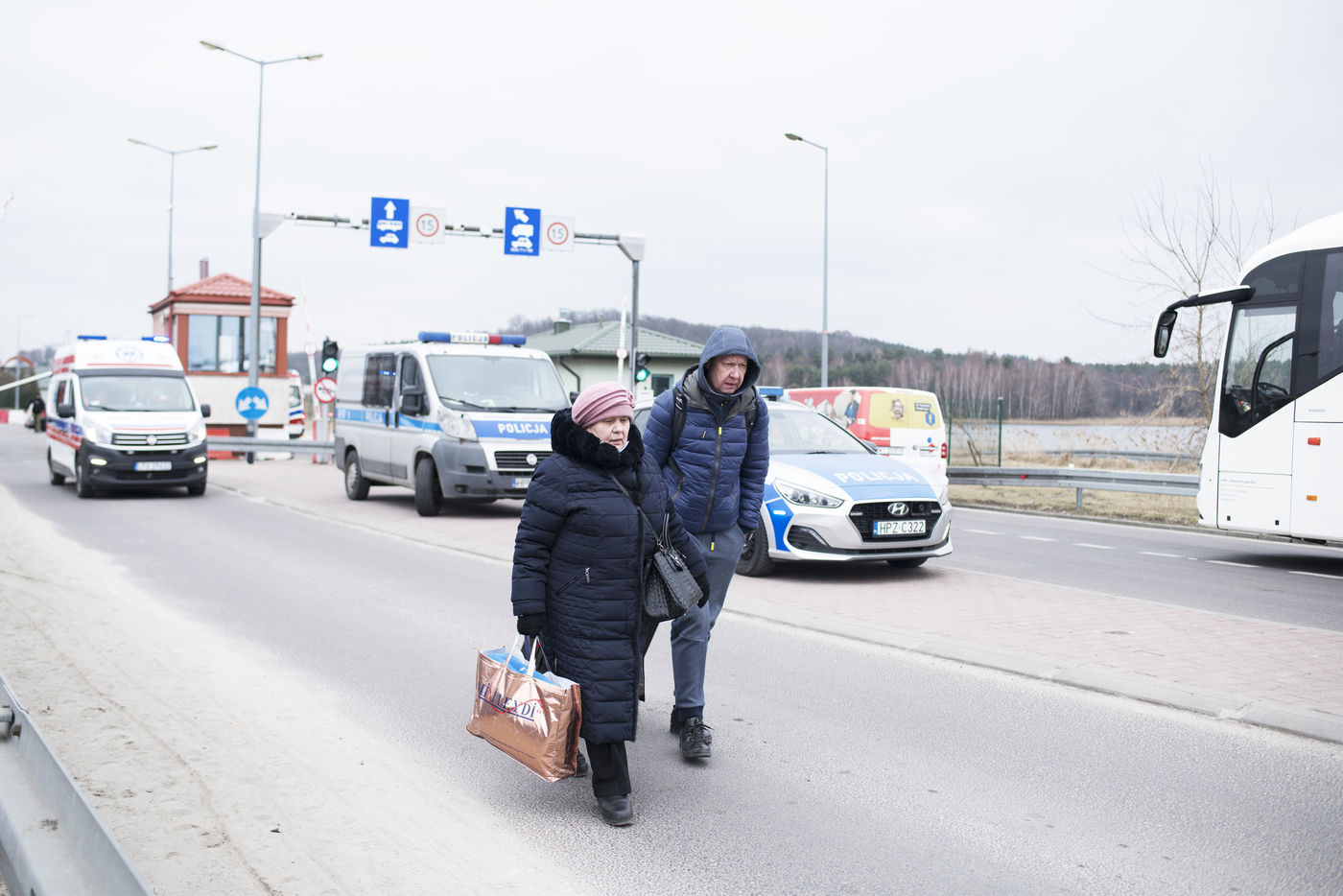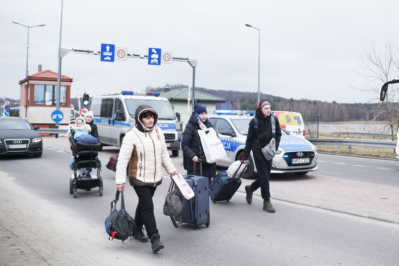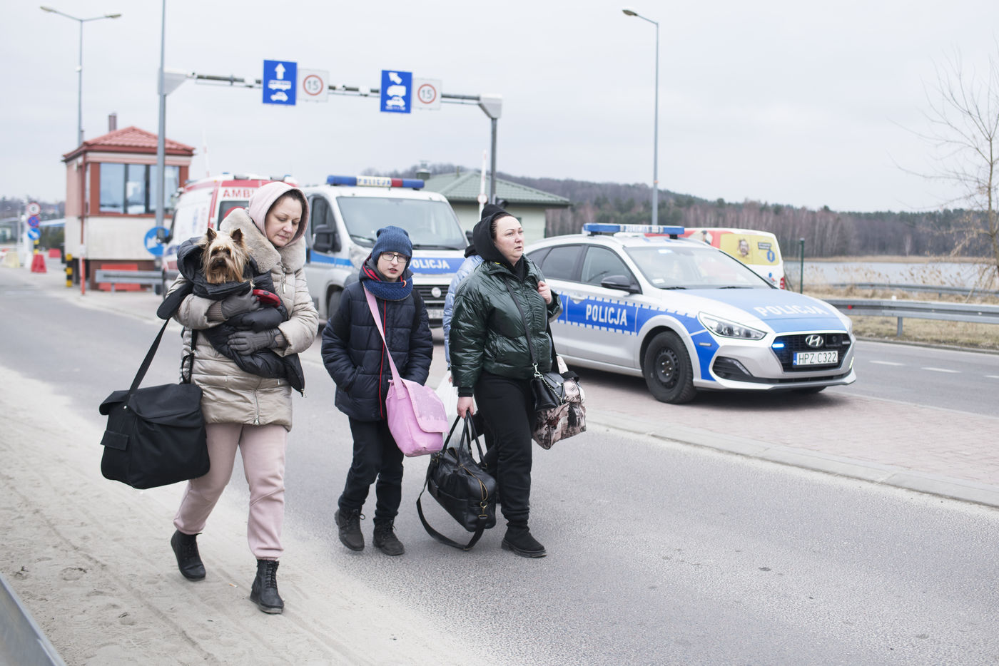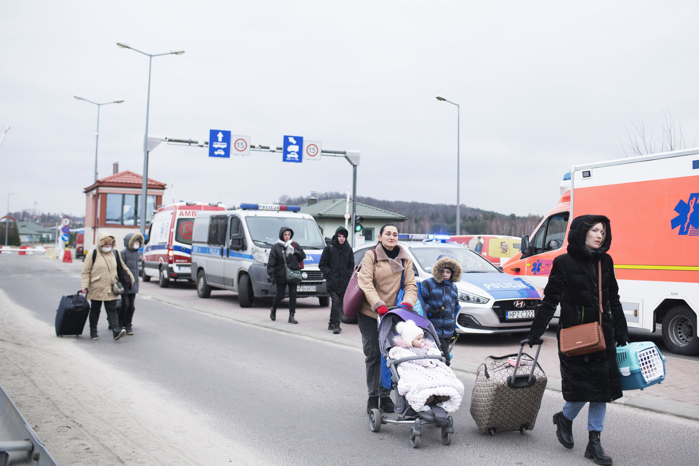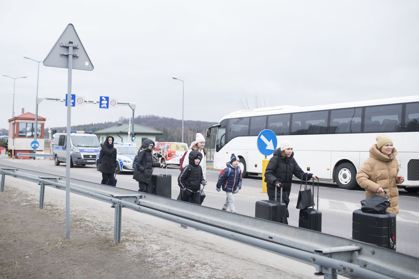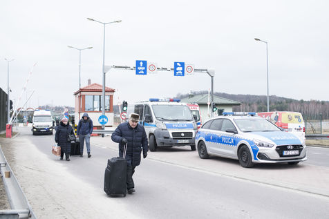 Ukrainian refugees cross the border between Ukraine and Poland near Hrebenne