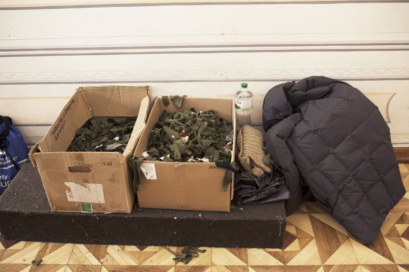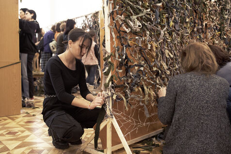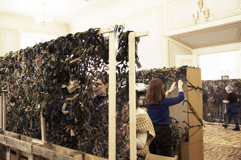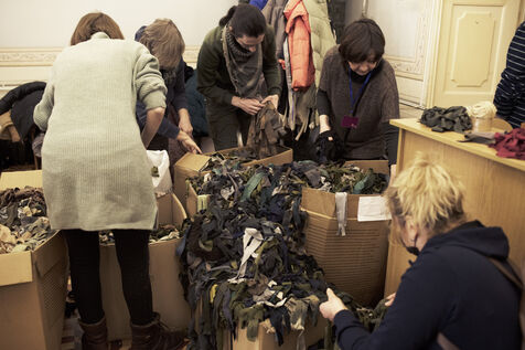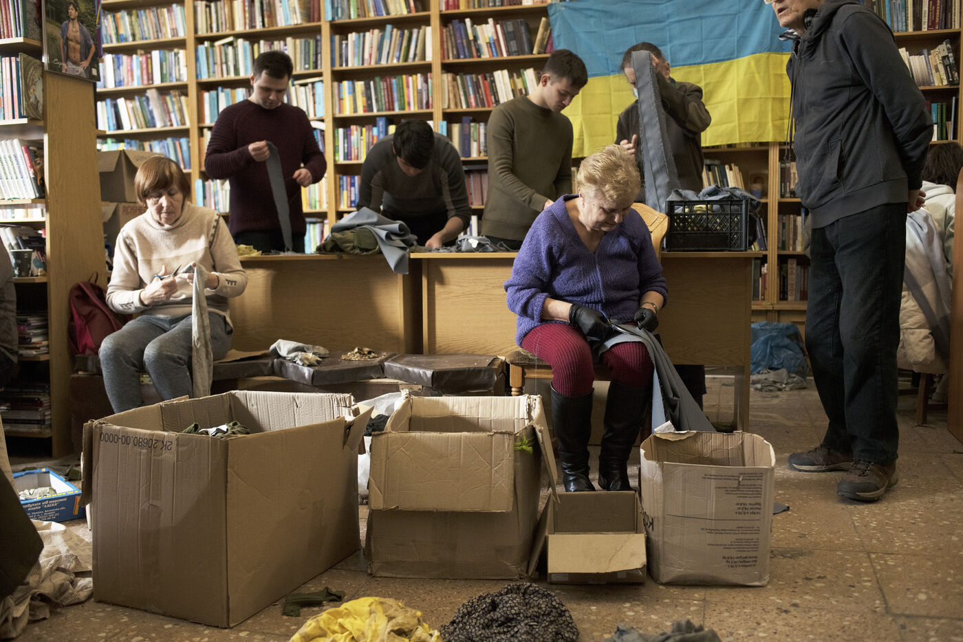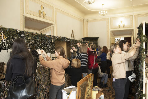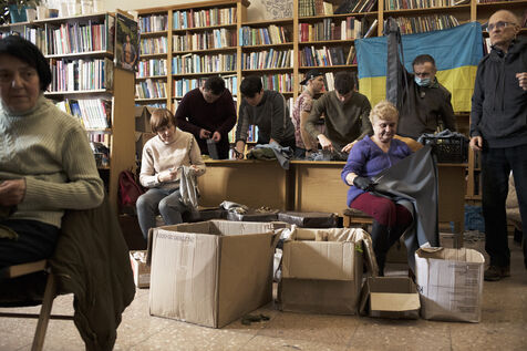 Volunteers gather in the library of the city of Lviv, Ukraine, to make camouflage nets to send to soldiers at the front in the east of the country, 10 March 2022.