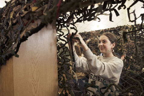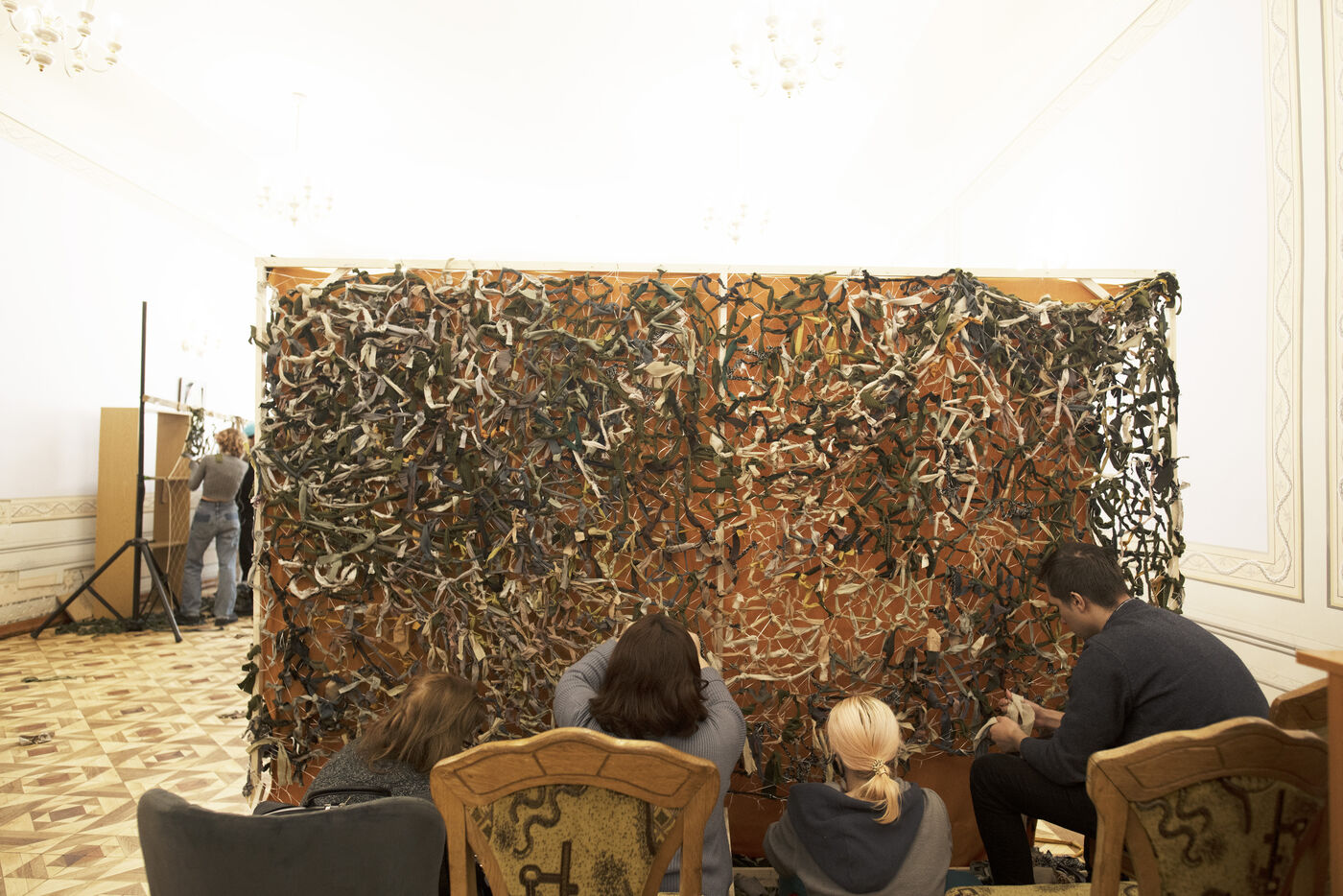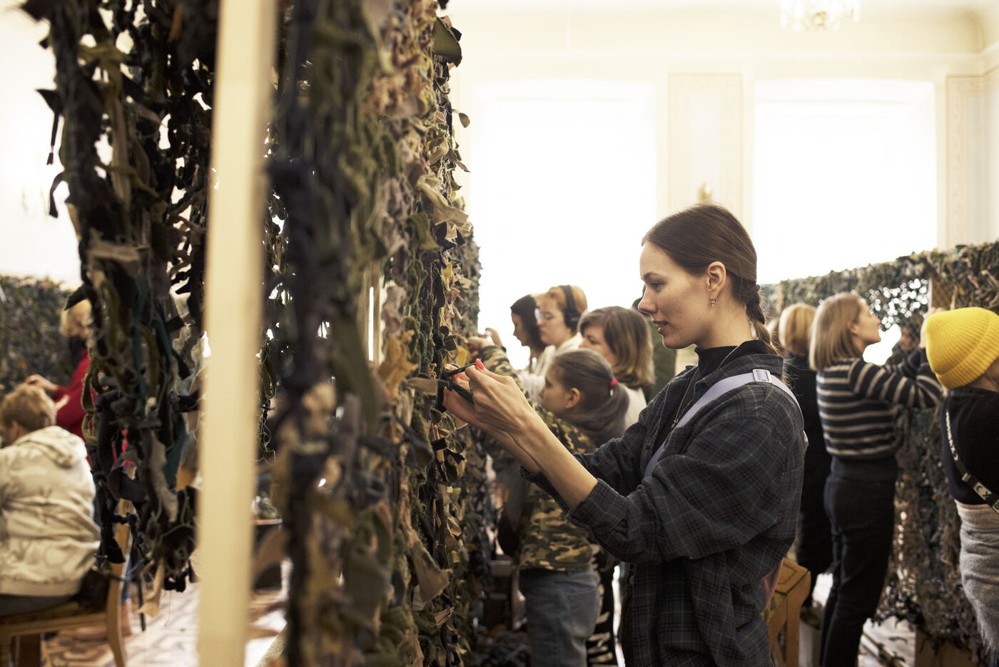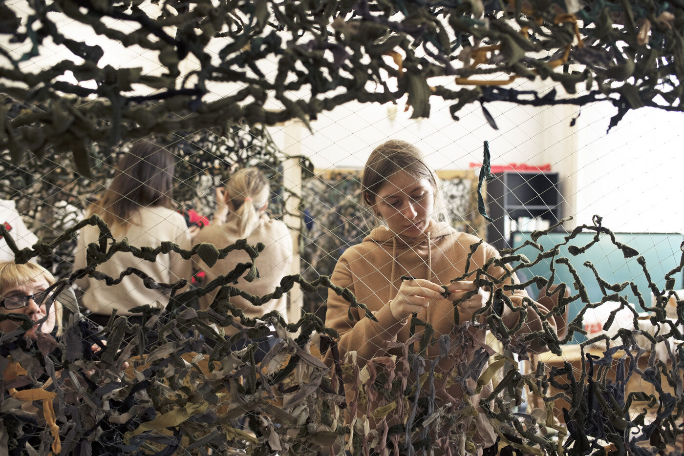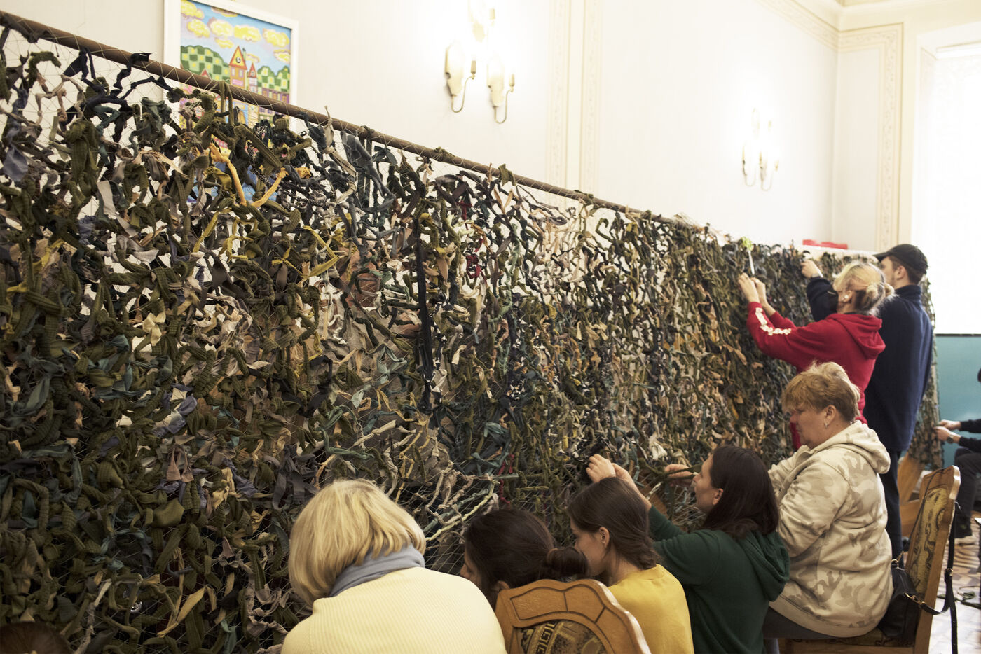 Volunteers make camouflage nets in Lviv for soldiers at the front in eastern Ukraine