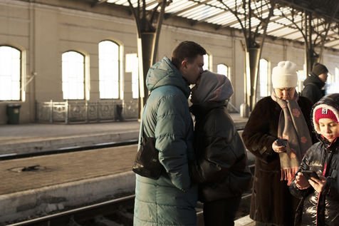 Ukrainian men say goodbye to their lovers before they take a train from Lviv station to leave the country and flee the war. All men from 18 to 60 are forbidden to leave the country.