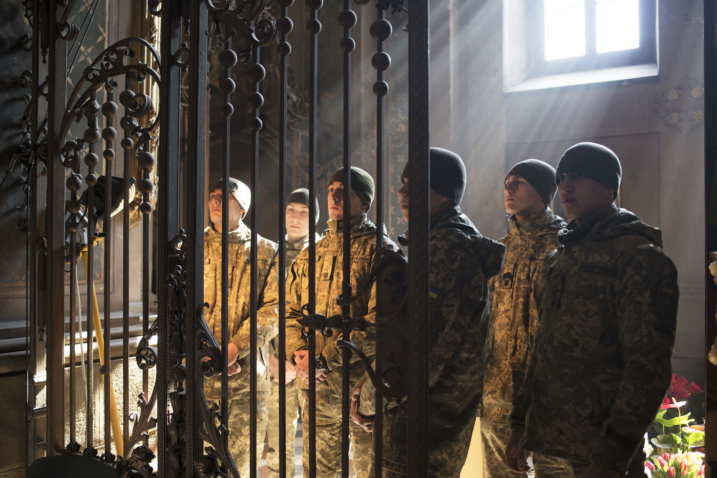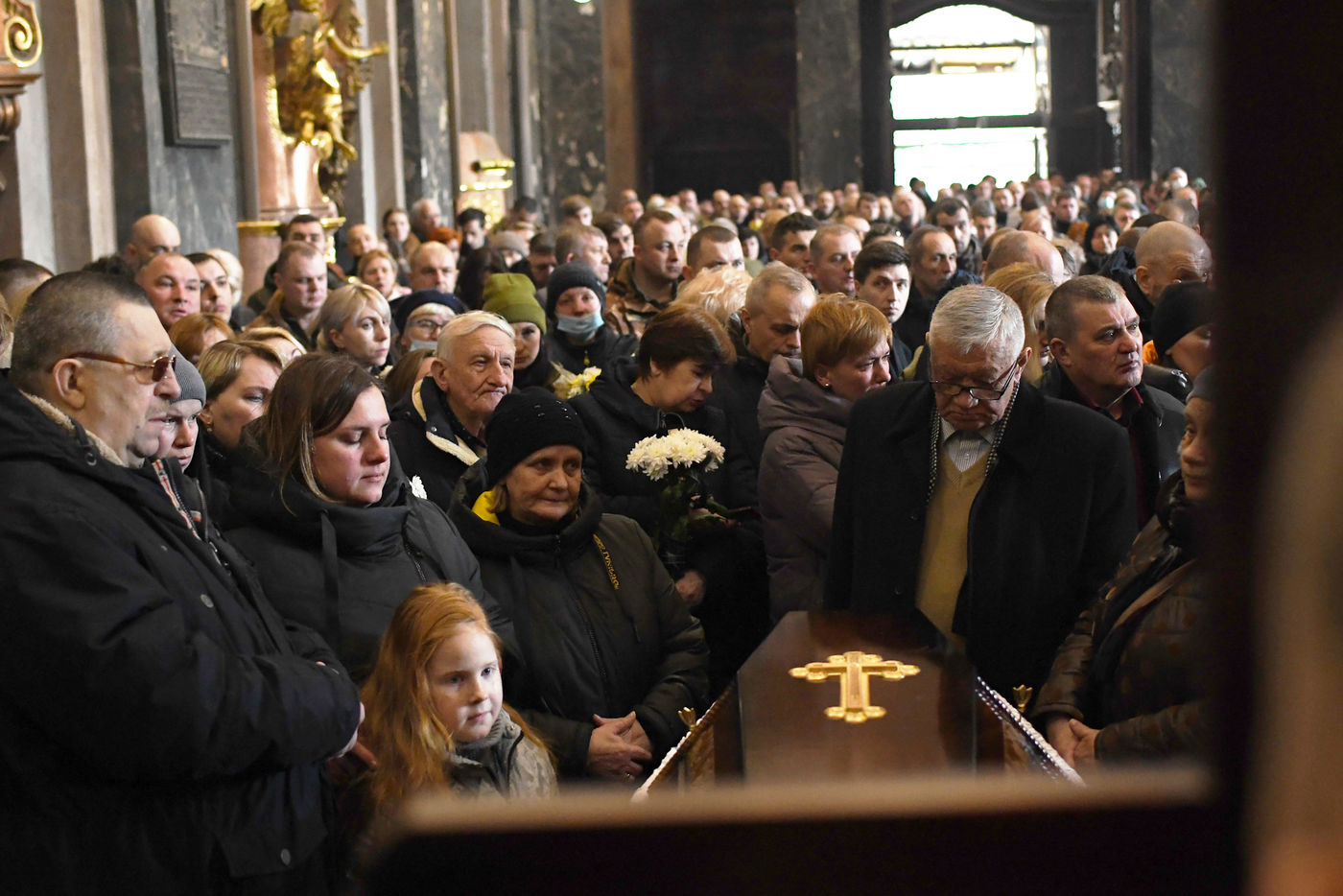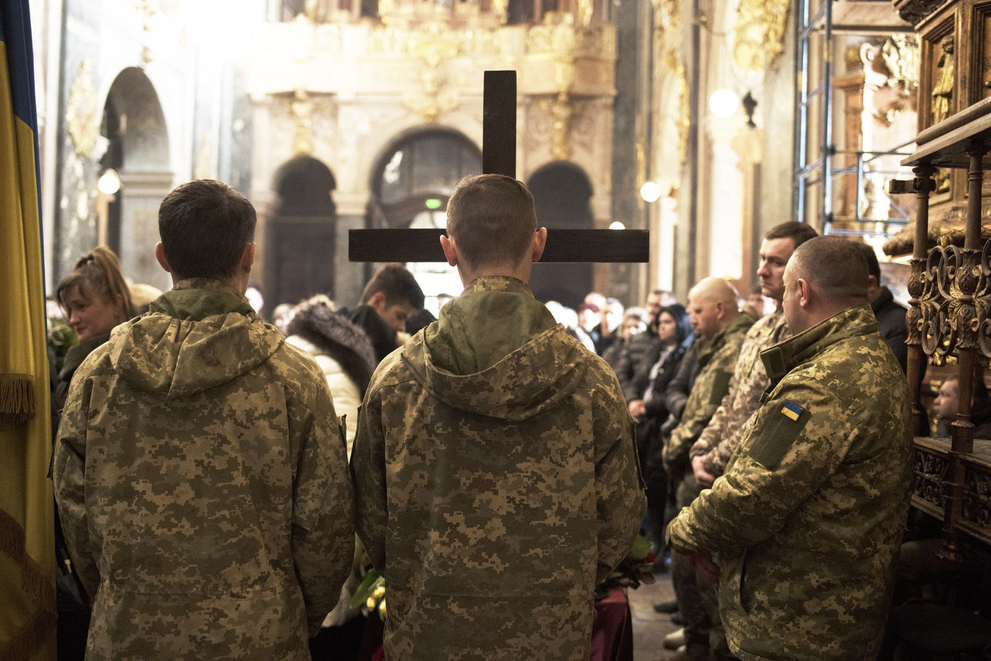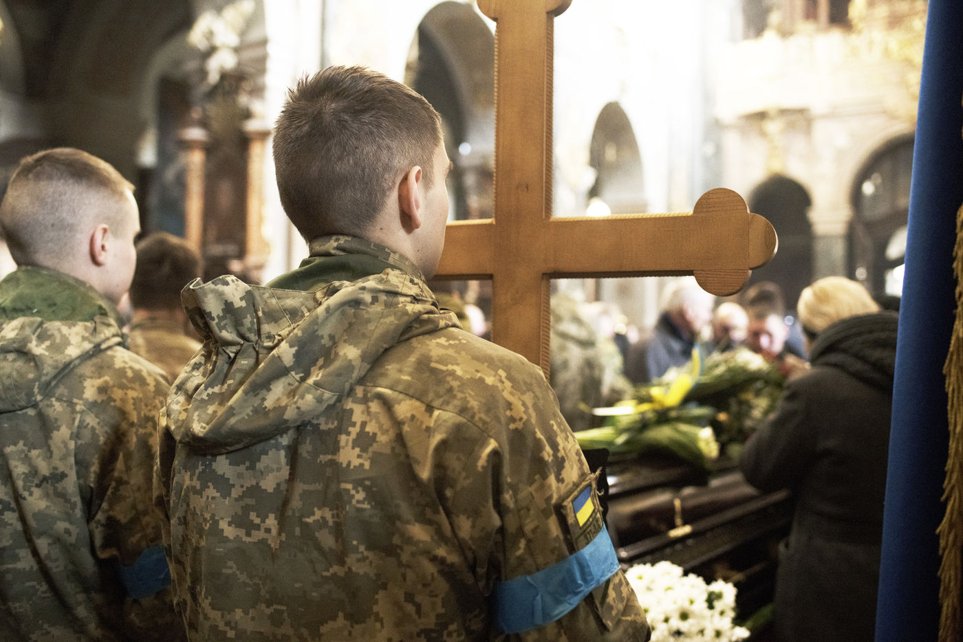 Ce Mardi 15 mars 2022, à Lviv, dans l'église Saint Peter and Paul Garrison, prenaient place les funérailles de quatre soldats ukrainiens morts au front au cours de la guerre entre l'Ukraine et la Russie. Les quatre soldats ont été tués dimanche dans l'attaque de la base d'entraînement militaire de Yavoriv, à l'Ouest de l'Ukraine. L'attaque aurait tué au moins 35 personnes. Après les funérailles, mardi, se sont suivis les enterrements de trois des soldats, Oleg Yaschyshyn, Serhiy Melnyk et Rostyslav Romanchuk. Kyrylo Vyshyvanyi, le quatrième soldat, a été enterré dans sa ville natale, à Duliby, dans la région de Lviv.