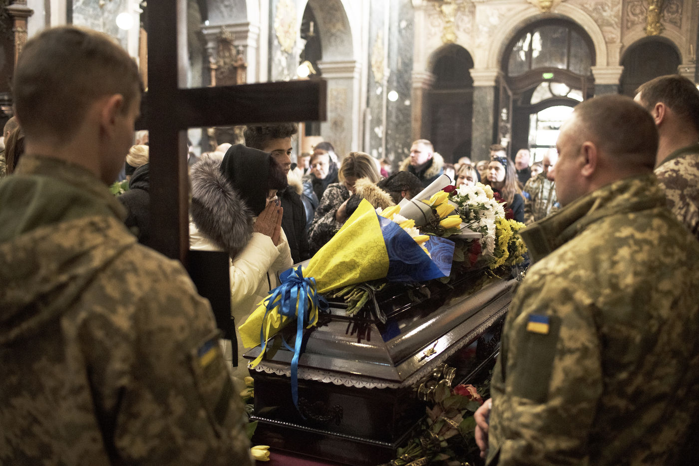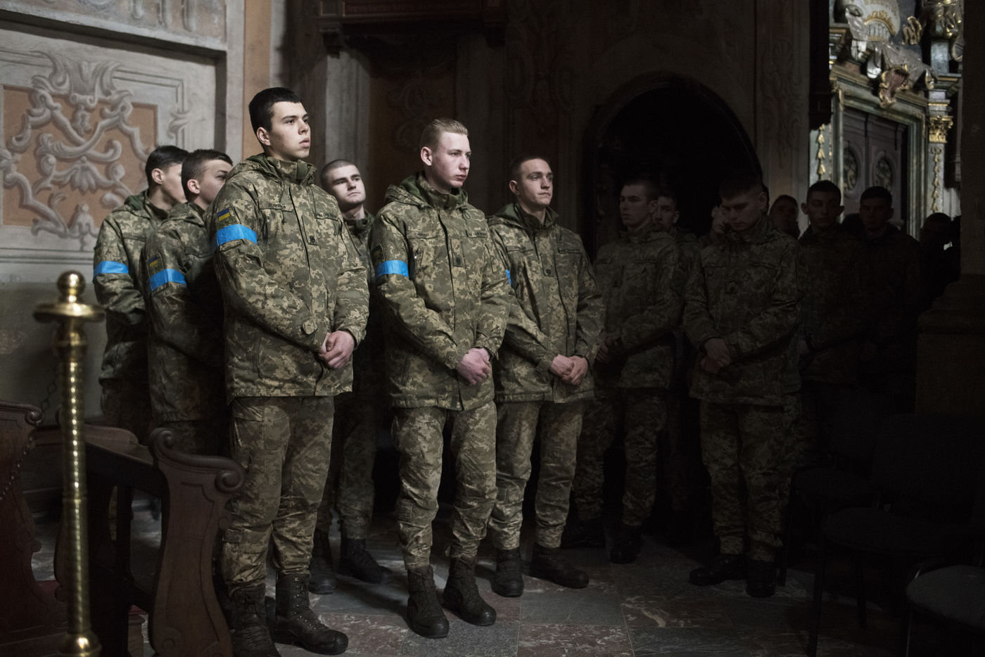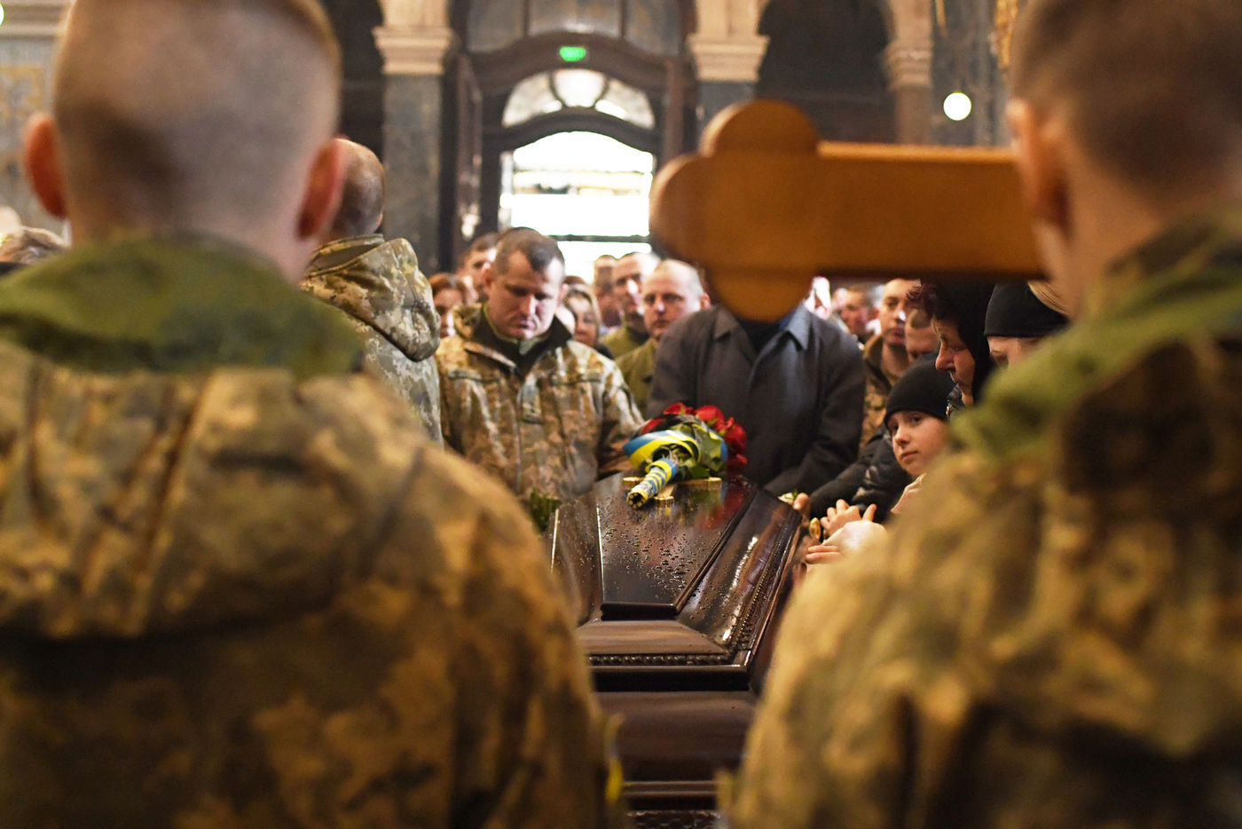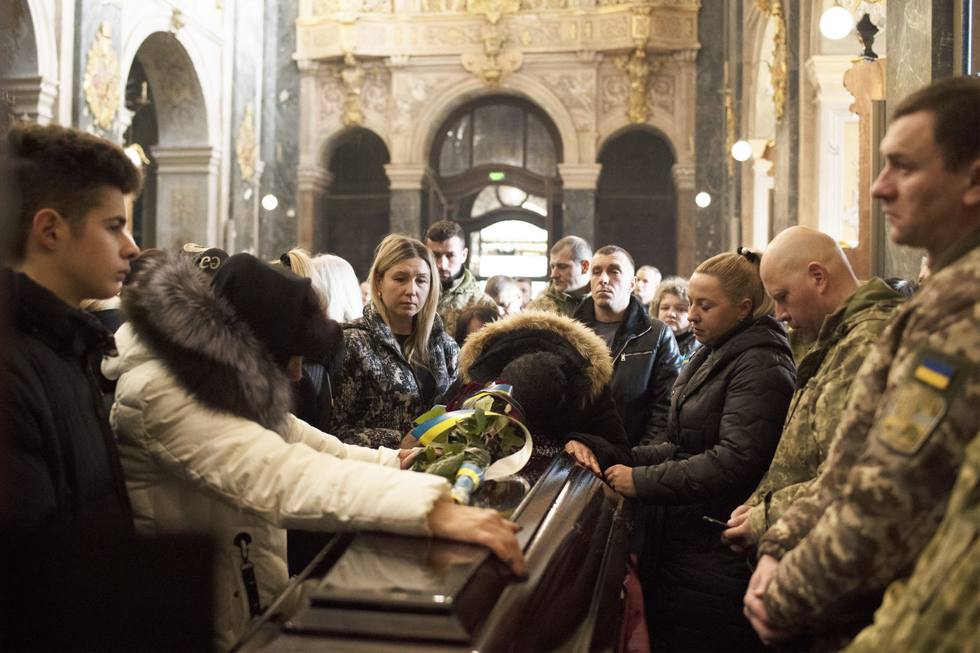 Ce Mardi 15 mars 2022, à Lviv, dans l'église Saint Peter and Paul Garrison, prenaient place les funérailles de quatre soldats ukrainiens morts au front au cours de la guerre entre l'Ukraine et la Russie. Les quatre soldats ont été tués dimanche dans l'attaque de la base d'entraînement militaire de Yavoriv, à l'Ouest de l'Ukraine. L'attaque aurait tué au moins 35 personnes. Après les funérailles, mardi, se sont suivis les enterrements de trois des soldats, Oleg Yaschyshyn, Serhiy Melnyk et Rostyslav Romanchuk. Kyrylo Vyshyvanyi, le quatrième soldat, a été enterré dans sa ville natale, à Duliby, dans la région de Lviv.