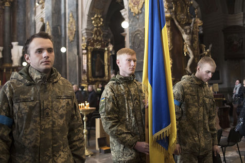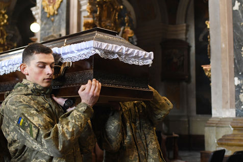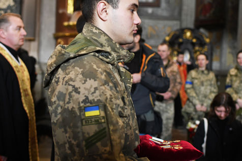 This Tuesday, March 15, 2022, in Lviv, in the church of Saint Peter and Paul Garrison, took place the funeral of four Ukrainian soldiers who died at the front during the war between Ukraine and Russia. The four Ukrainian soldiers were killed on Sunday in a Russian attack on Yavoriv training base in western Ukraine. The attack killed at least 35 people. After the funerals burials were held Tuesday for three soldiers, Oleg Yaschyshyn, Serhiy Melnyk and Rostyslav Romanchuk. Kyrylo Vyshyvanyi, the fourth soldier, was buried in his hometown of Duliby in the Lviv region.