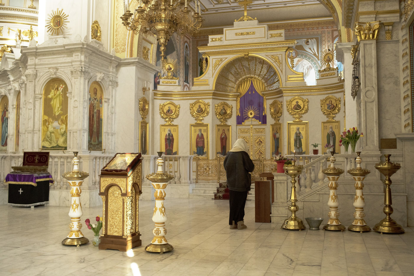 Ukrainians pray in the Cathedral of the Transfiguration in Odessa on March 21, 2022, as the city prepares for a Russian attack.