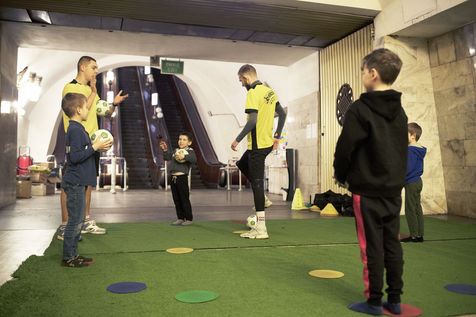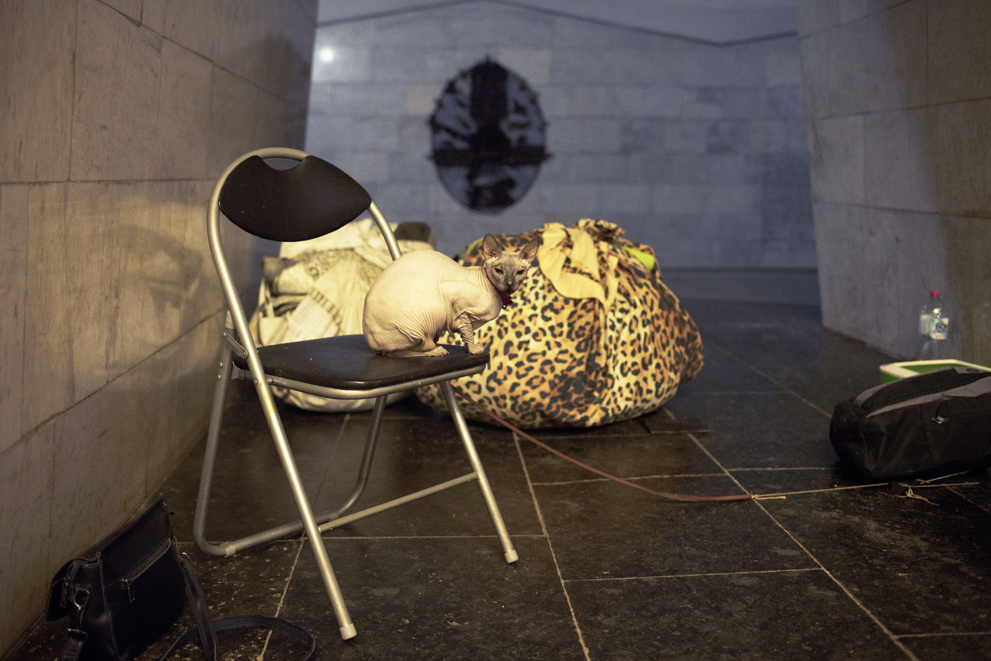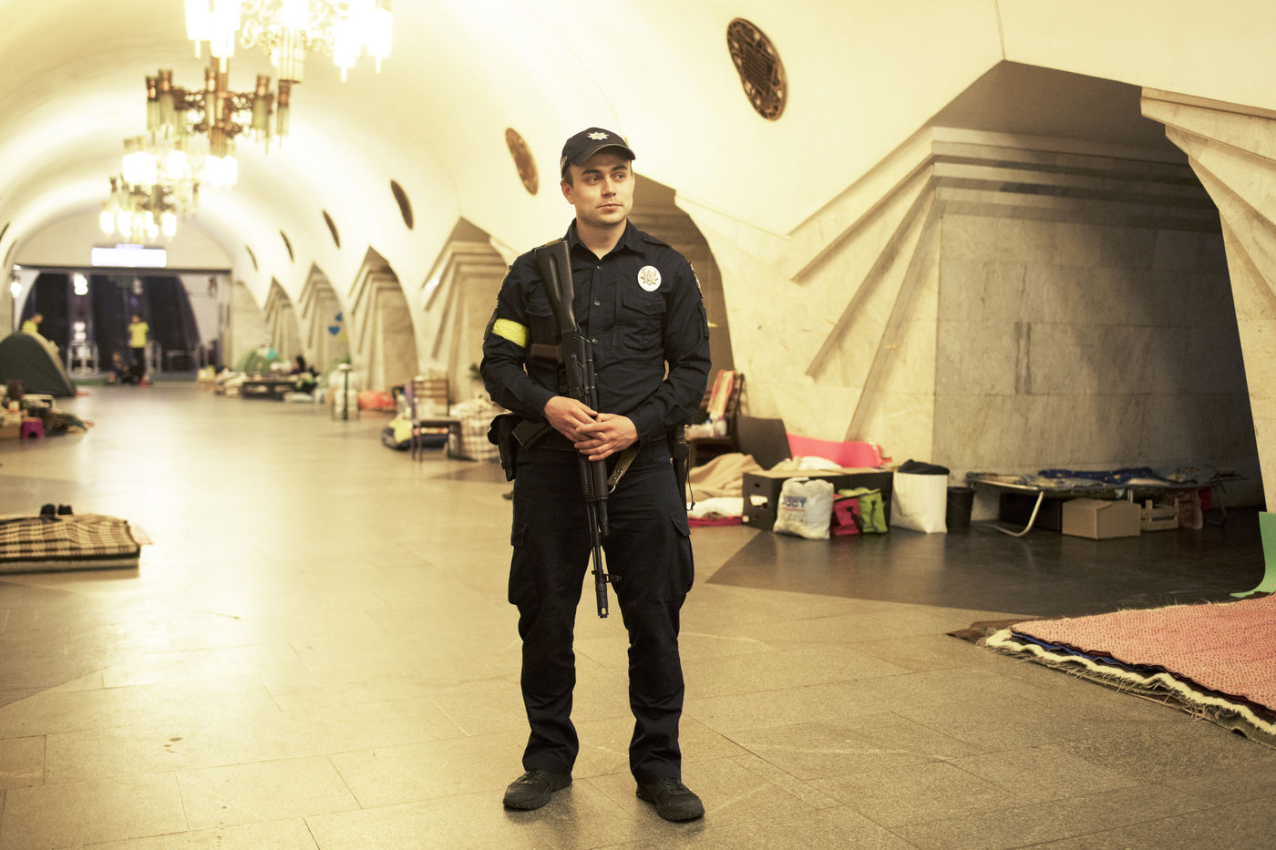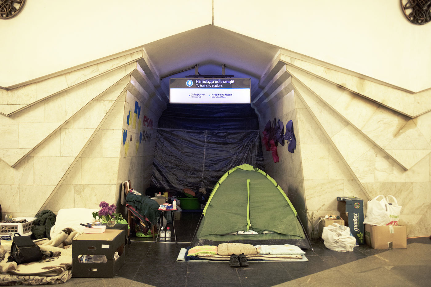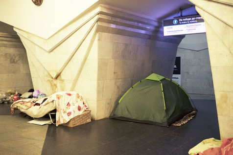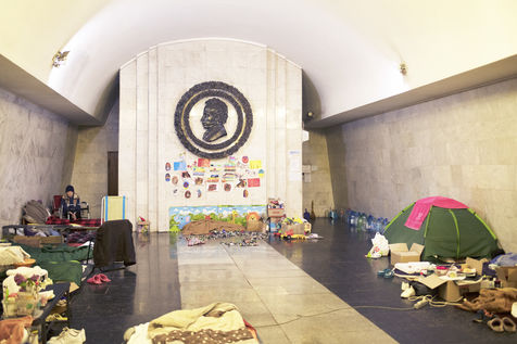 Dans la ville de Kharkiv a 40 kilomètres de la frontière russe, bombardée depuis des semaines, de nombreux bâtiments civils ont été détruits par des missiles russes. Depuis le début de la guerre, des milliers d'habitants s'abritent dans les stations de métro de la ville. Un demi wagon ou quelques mètres carrés sur un des quais sont devenus l'espace de vie de certaines familles depuis maintenant plus de deux mois. Le 16 mai 2022, dans la station Pushkinska.