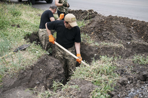 Ukraine : Ukrainian soldiers dig trenches in downtown Lysychansk