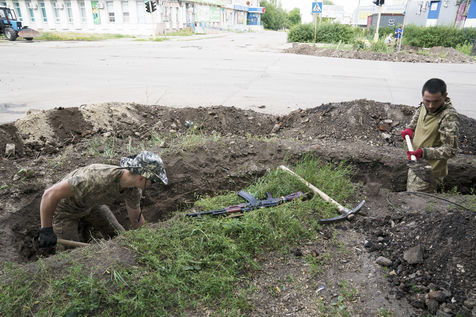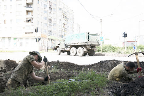 In eastern Ukraine, the Russians are trying to advance to Lysychansk after taking a large part of Sievierodonetsk. Ukrainian soldiers dig trenches in the city center to prepare for the arrival of Russian soldiers. June 16, 2022.