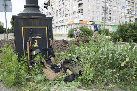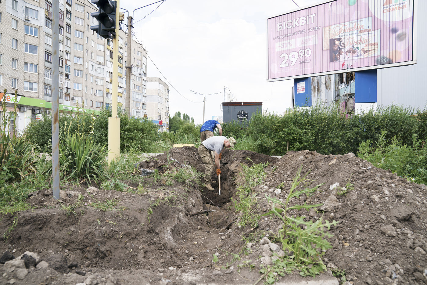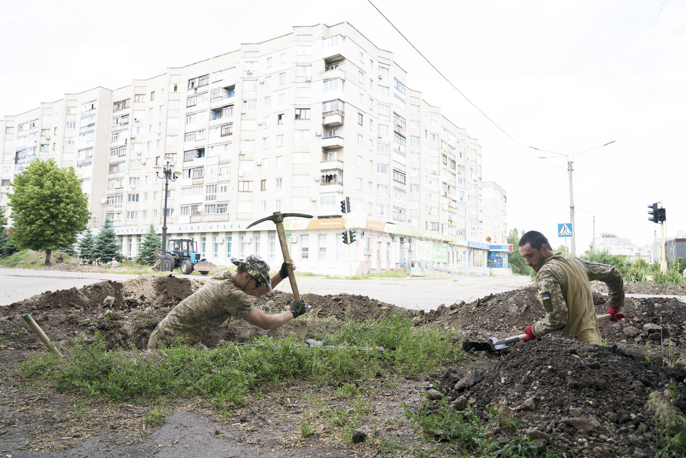 Ukraine : Des soldats ukrainiens creusent des tranchées dans le centre-ville de Lysychansk