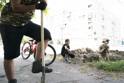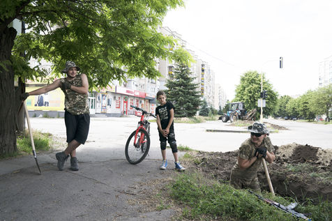 À l'Est de l'Ukraine, les russes essayent d'avancer vers Lysychansk après avoir pris une grande partie de Sievierodonetsk. Des soldats ukrainiens creusent des tranchées dans le centre-ville pour se préparer à l'arrivée des soldats russes. Le 16 juin 2022.