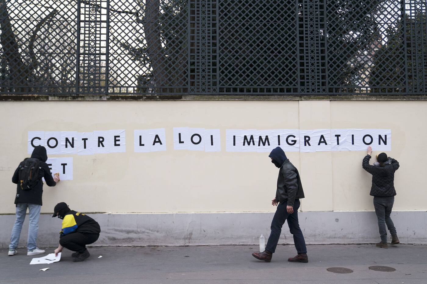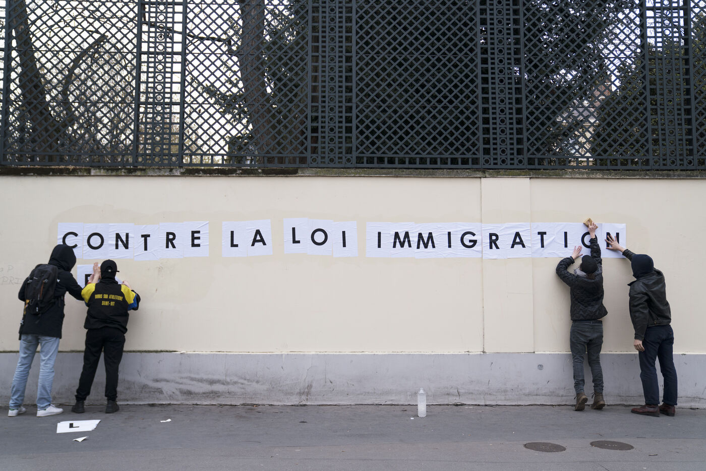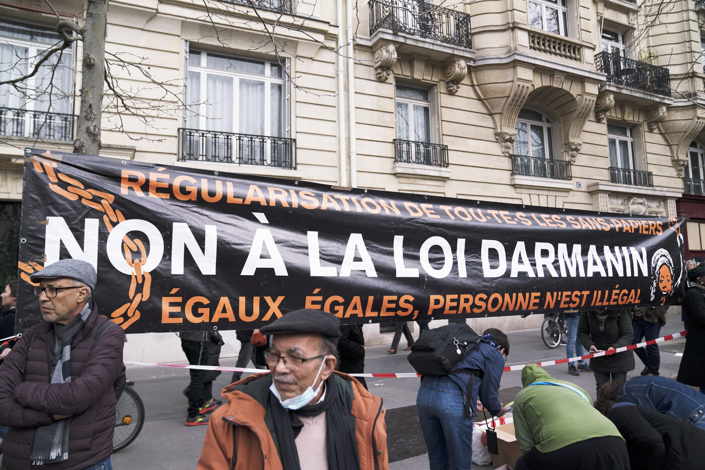 Action against Darmanin's immigration bill which foresees more repression and precariousness for undocumented and foreign workers, and for the regularization of all undocumented workers. On Wednesday 15 March 2023, during the demonstration against the pension reform. The demonstrators took the street from the Esplanade des Invalides to Place d'Italie, for this new day of mobilization in Paris.