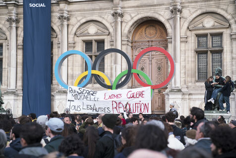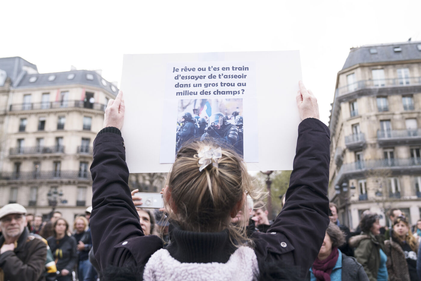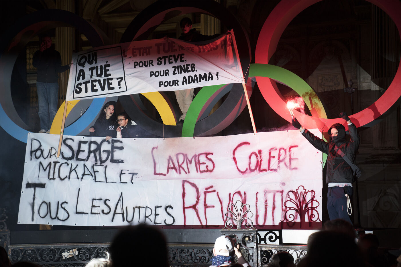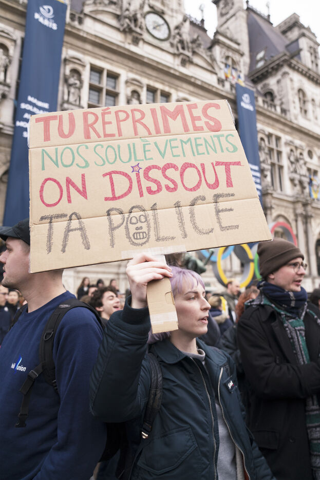 Rassemblement contre les violences policières à Paris, après que plus de 200 manifestants aient été blessés à Sainte-Soline, le samedi 25 mars. Le rassemblement a d'abord pris place à Hôtel de Ville en hommage aux victimes de violences policières, particulièrement aux deux personnes tombées dans le coma après la manifestation de Sainte-Soline contre les méga-bassines, et aux nombreux autres blessés. Ce jour-là, plus de 4000 grenades ont été tirées sur les manifestants par les forces de l'ordre. Une manifestation sauvage a ensuite traversé Paris. Jeudi 30 mars 2023.