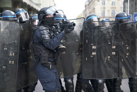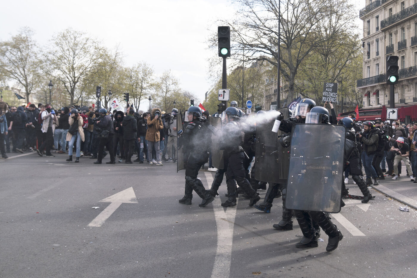 Grève générale et manifestation contre la réforme des retraites et le 49.3. Les manifestants ont de nouveau pris les rues de Paris, pour cette dernière journée de mobilisation avant la décision du Conseil Constitutionnel. La manifestation est partie d'Opéra jusqu'à Place de la Bastille. Nombreux jets de gaz lacrymogènes et charges policières. Jeudi 13 avril 2023.