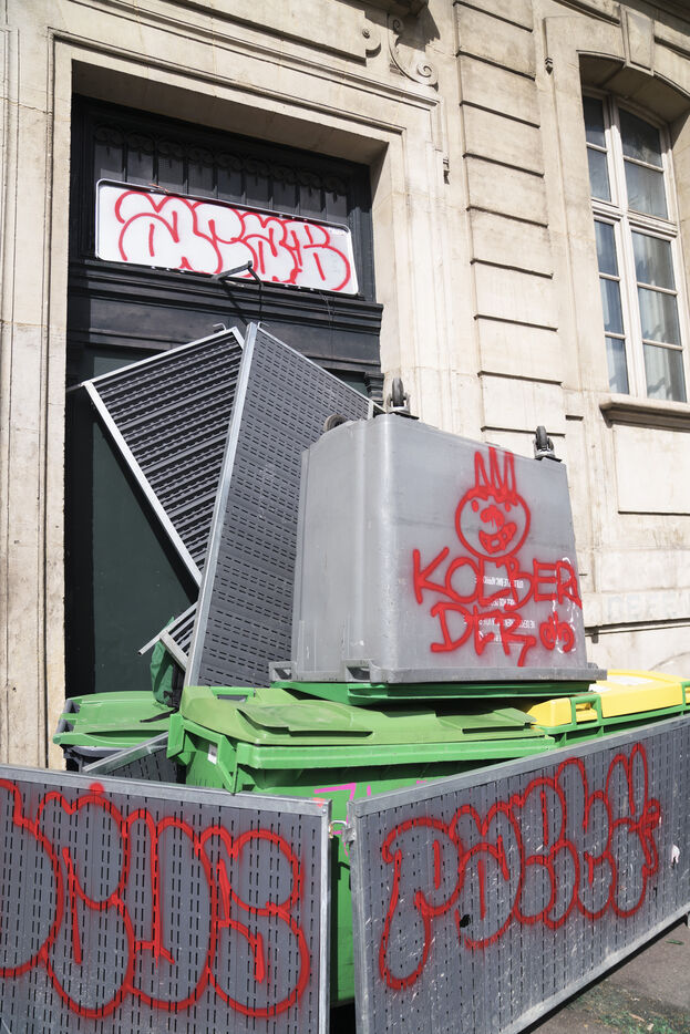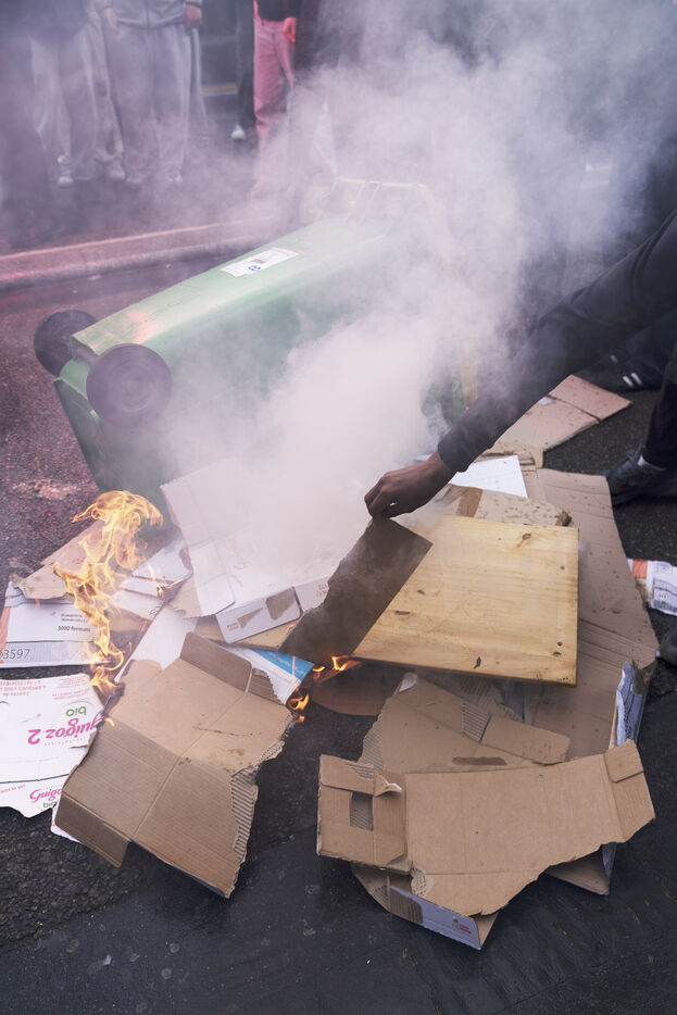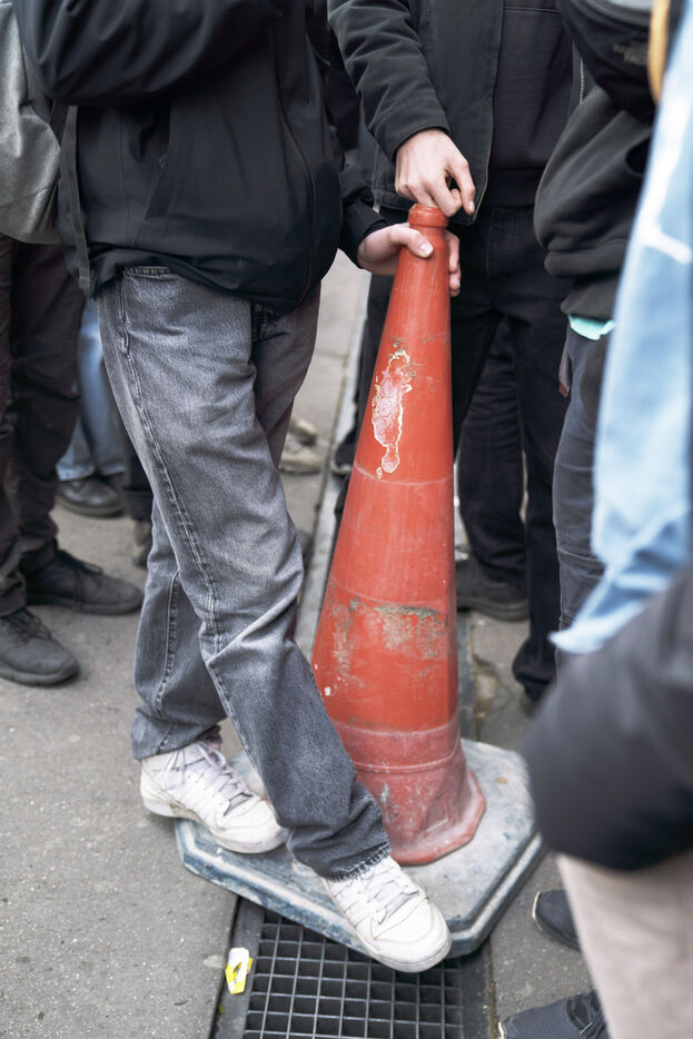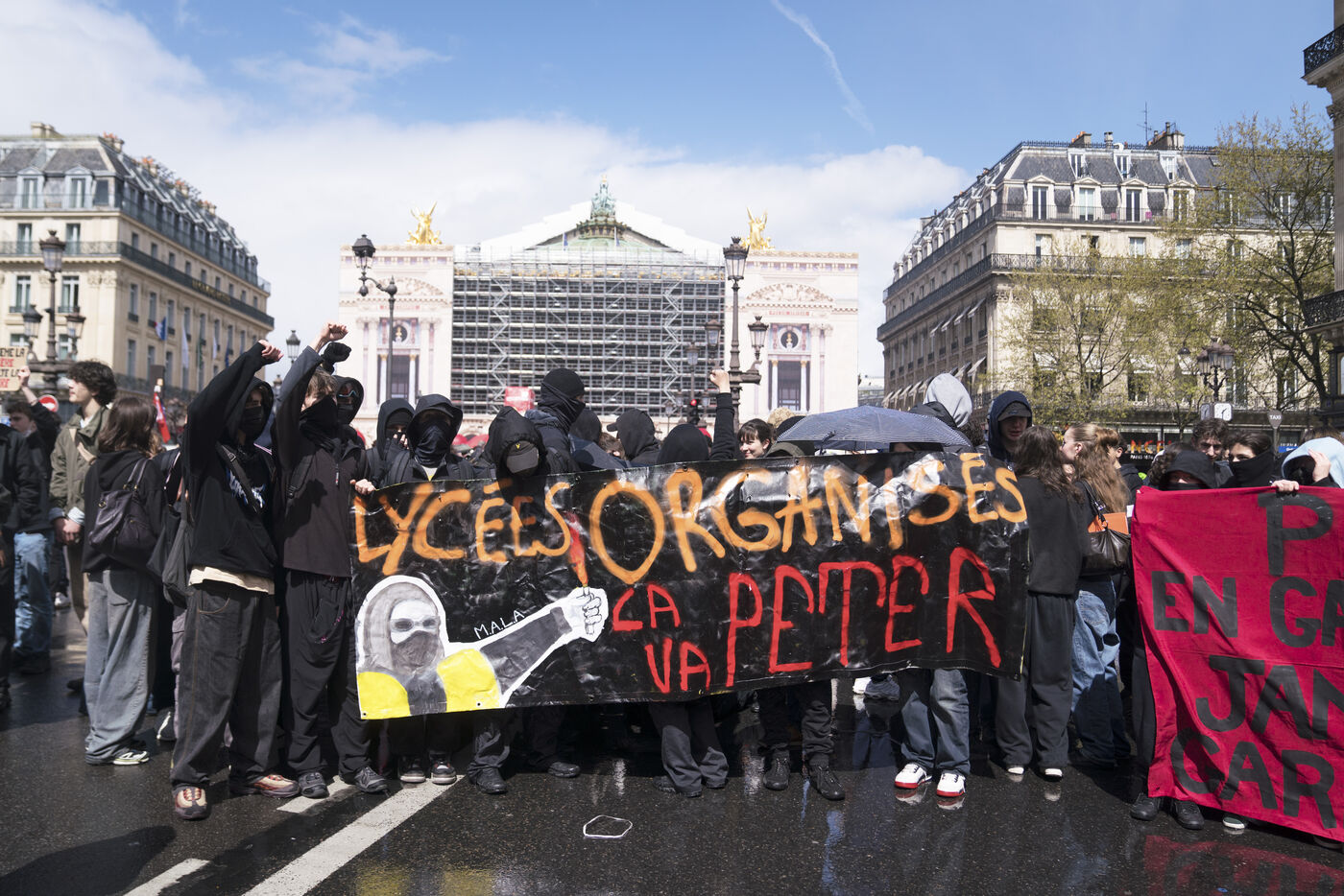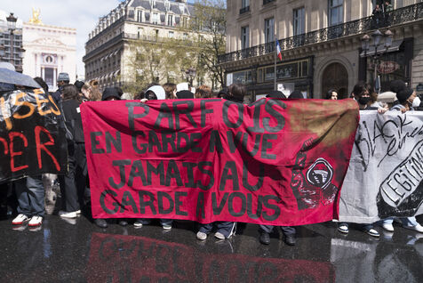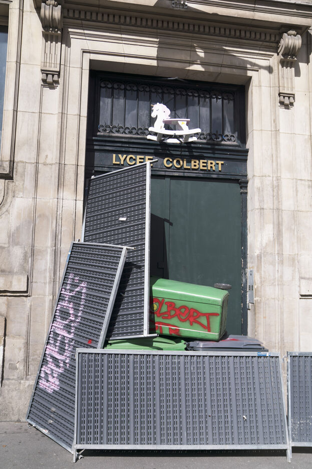 Blockade of the Lycée Colbert and demonstration of high school students for the General Strike day of April 13 against the pension reform and the 49.3. The students then joined the interprofessional demonstration starting from Place de l'Opéra, for this last day of mobilization before the decision of the Constitutional Council. Thursday, April 13, 2023.