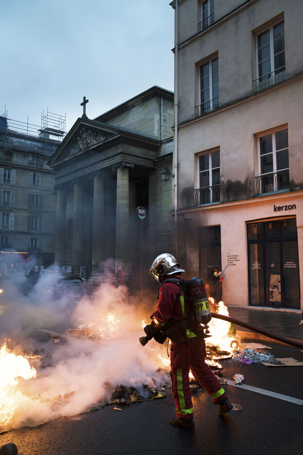 Demonstration after the decision of the Constitutional Council concerning the pension reform. Demonstrators took to the streets of Paris again, lighting many fires after the Constitutional Council validated the main part of the pension reform. Friday, April 14, 2023.