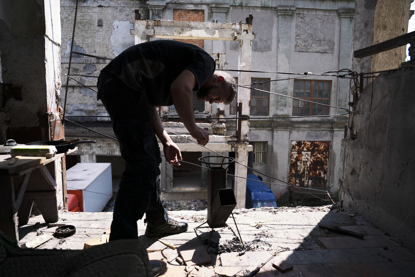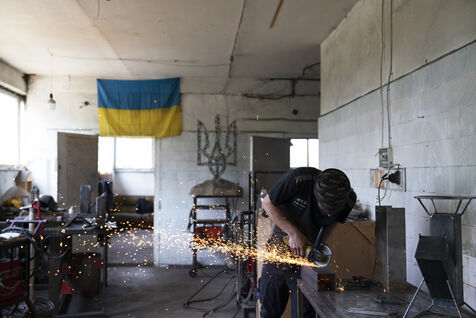 Volunteers make stoves for villages without electricity in Ukraine, in one of the warehouses in the town of Odesa, May 31, 2023. Sculptor Serguey Vuk is one of the designers of this 7kg stove, which is distributed in many towns and villages in the Donbass region.