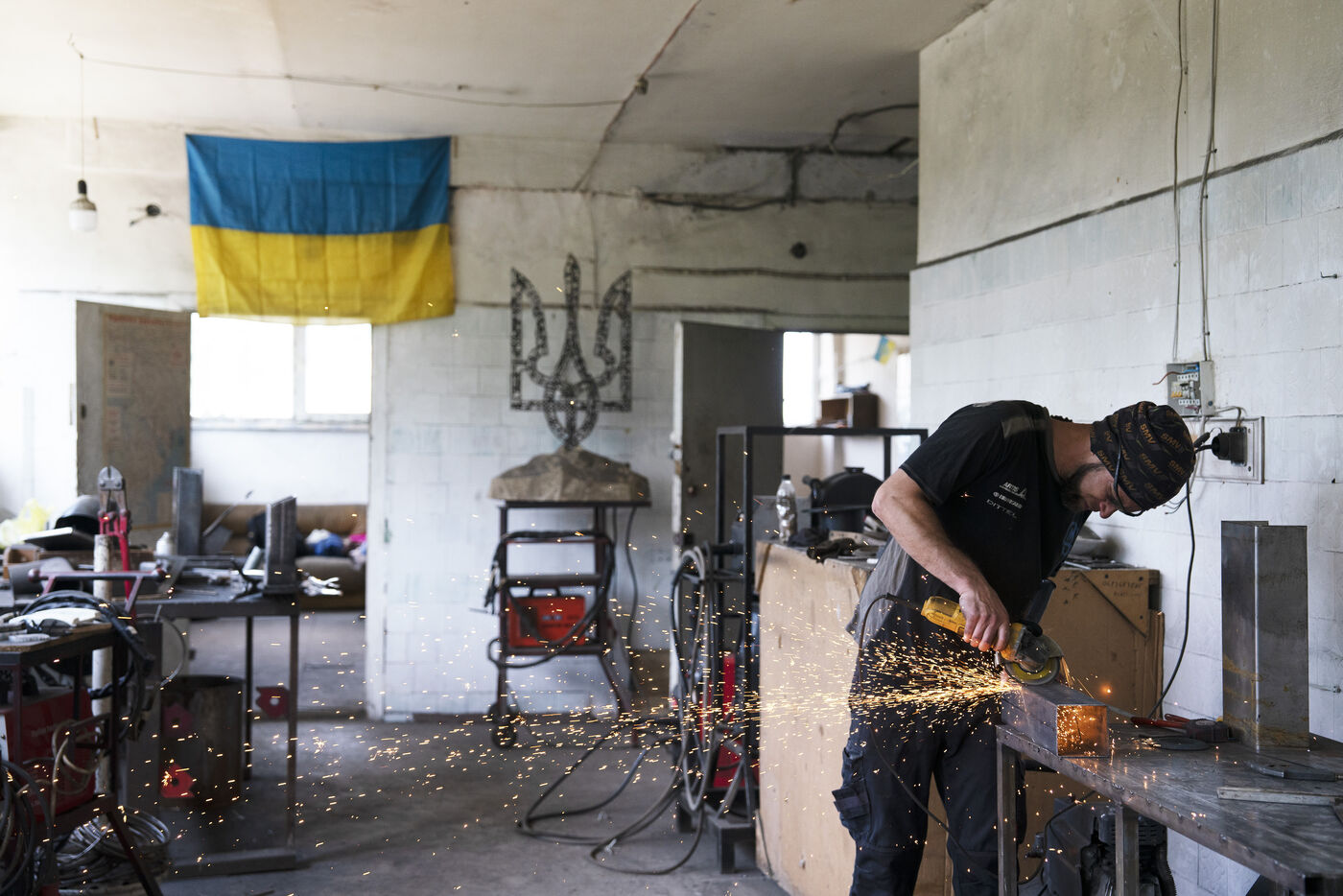 Des volontaires fabriquent des poêles pour les villages privés d'électricité en Ukraine, dans un des entrepôts de la ville d'Odesa, le 31 mai 2023. Serguey Vuk, sculpteur, fait partie de ceux qui ont conçu ce poêle de 7kg qui est distribué dans de nombreuses villes et villages du Donbass.
