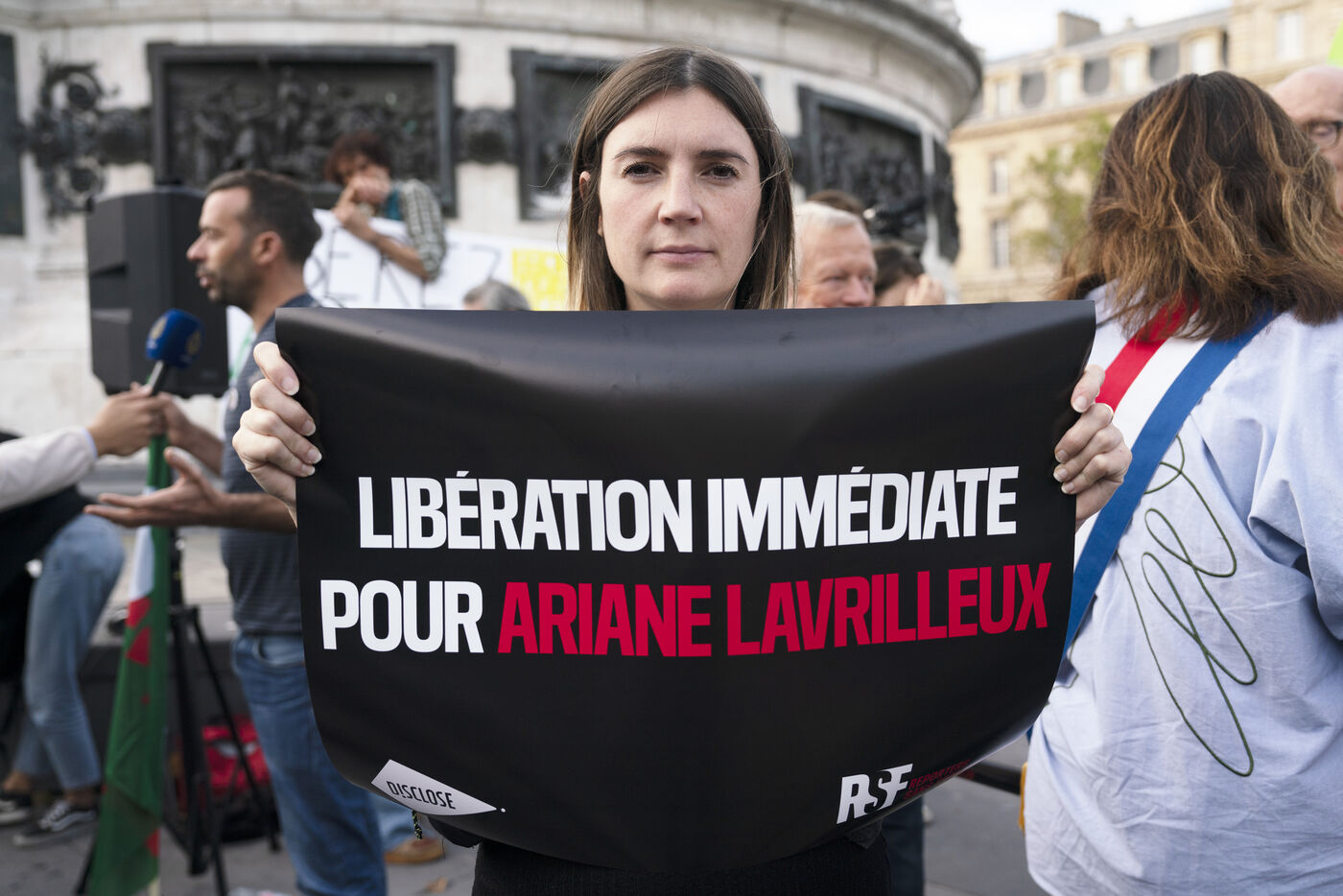Rassemblement en soutien à Ariane Lavrilleux, journaliste pour Disclose NGO, perquisitionnée et mise en garde à vue par la DGSI. Une centaine de personnes s'est réunie place de la République à Paris, le mercredi 20 septembre 2023 au soir, alors que la journaliste est en garde à vue depuis plus de 37 heures. Les enquêteurs de la DGSI lui reprochent d'avoir signé cinq articles sur les ventes d'armes françaises à l'étranger. Les manifestants et le site web d'investigation Disclose NGO dénoncent, en plus de l'interpellation et de la perquisition subies par la journaliste, une violation du secret des sources.