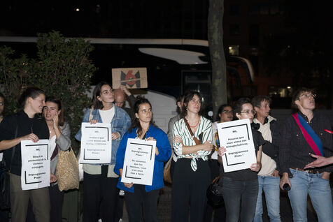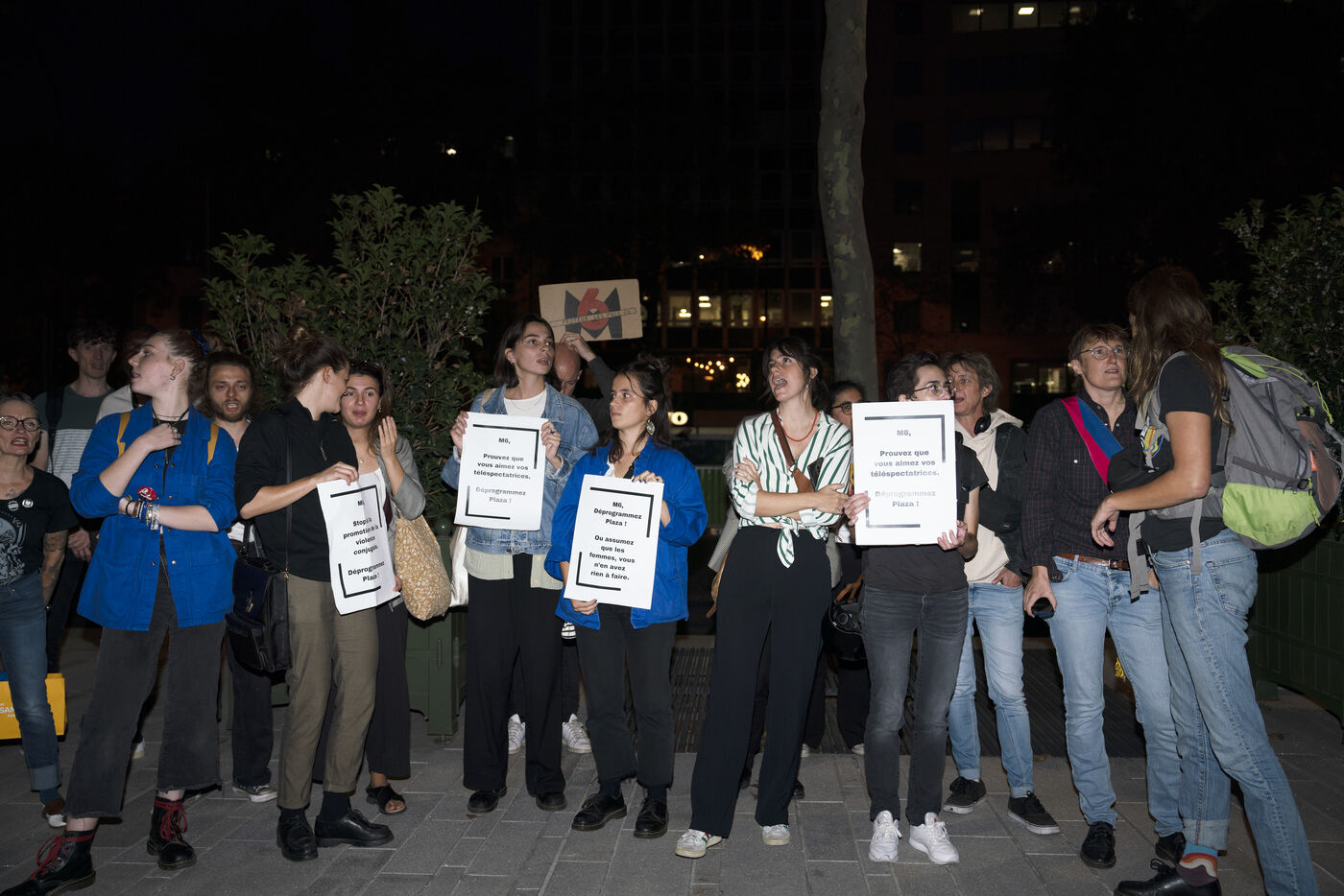 Rassemblement devant les locaux de M6 après les accusations à l'encontre de Stéphane Plaza pour violences conjugales et autres faits graves dans son cadre professionnel, pour interpeler la chaîne TV lui apportant son soutien, qui a notamment décidé de maintenir la diffusion d'un documentaire à sa gloire le 10 octobre au soir, en prime time, après les accusations de trois des ex-compagnes de l'animateur. Le 10 octobre 2023.