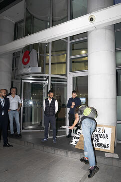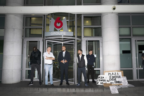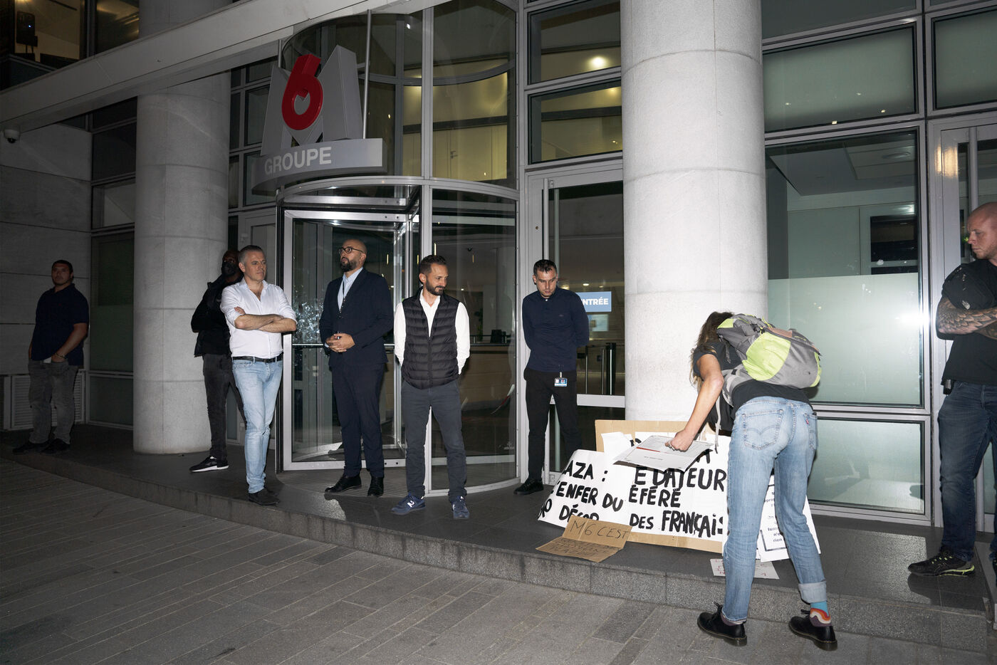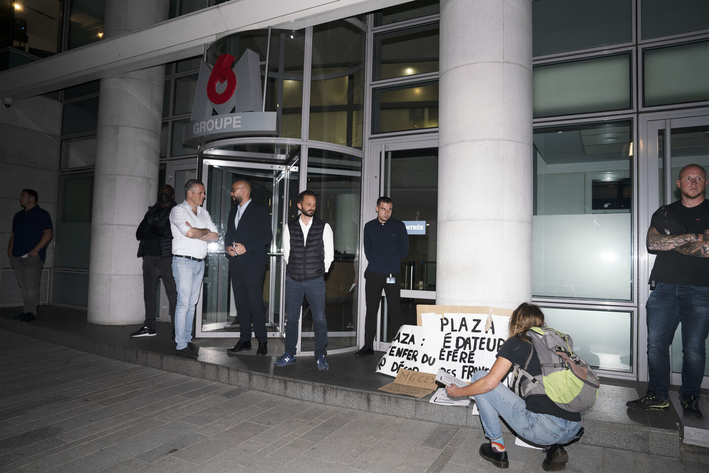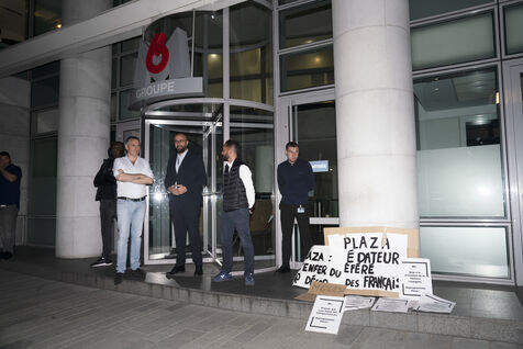 Gathering in front of the M6 offices following accusations against Stéphane Plaza of domestic violence and other serious acts in his professional capacity, to question the TV channel's support for him, which notably decided to maintain the broadcast of a documentary to his glory on the evening of October 10, in prime time, following the accusations made by three of the host's ex-wives. October 10, 2023.