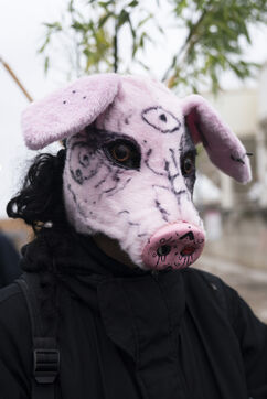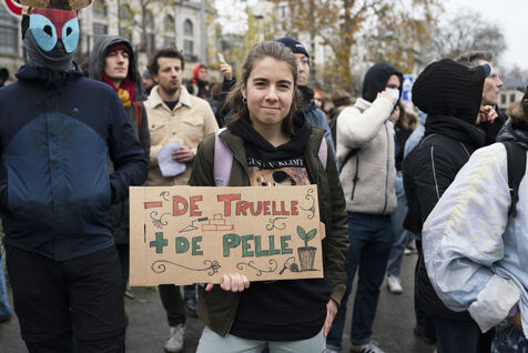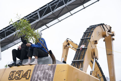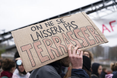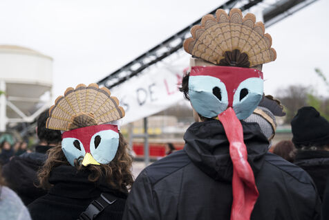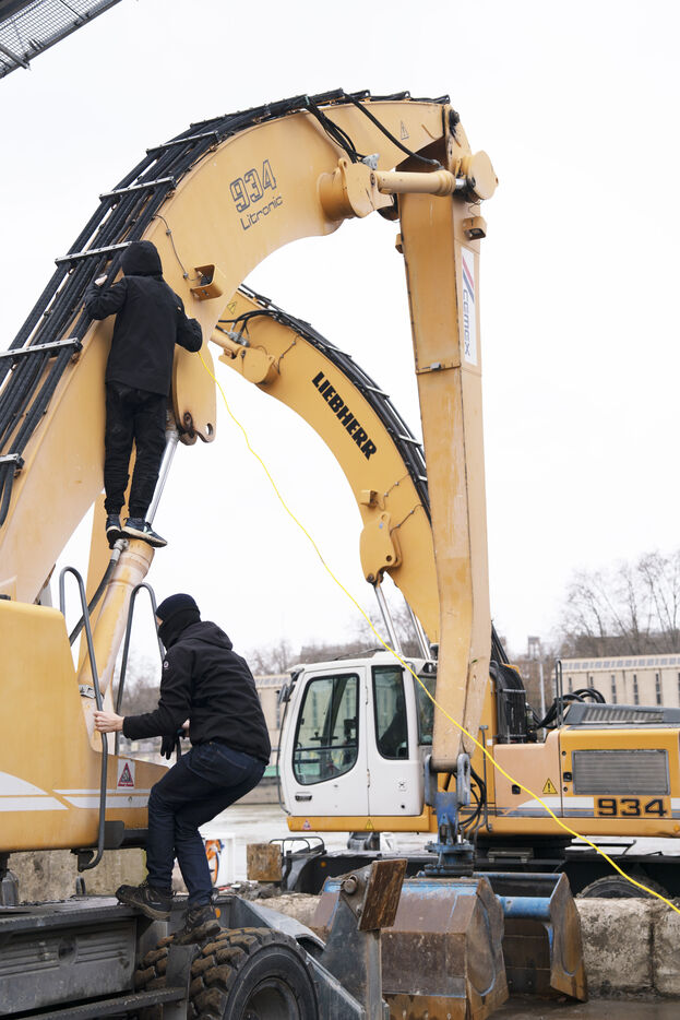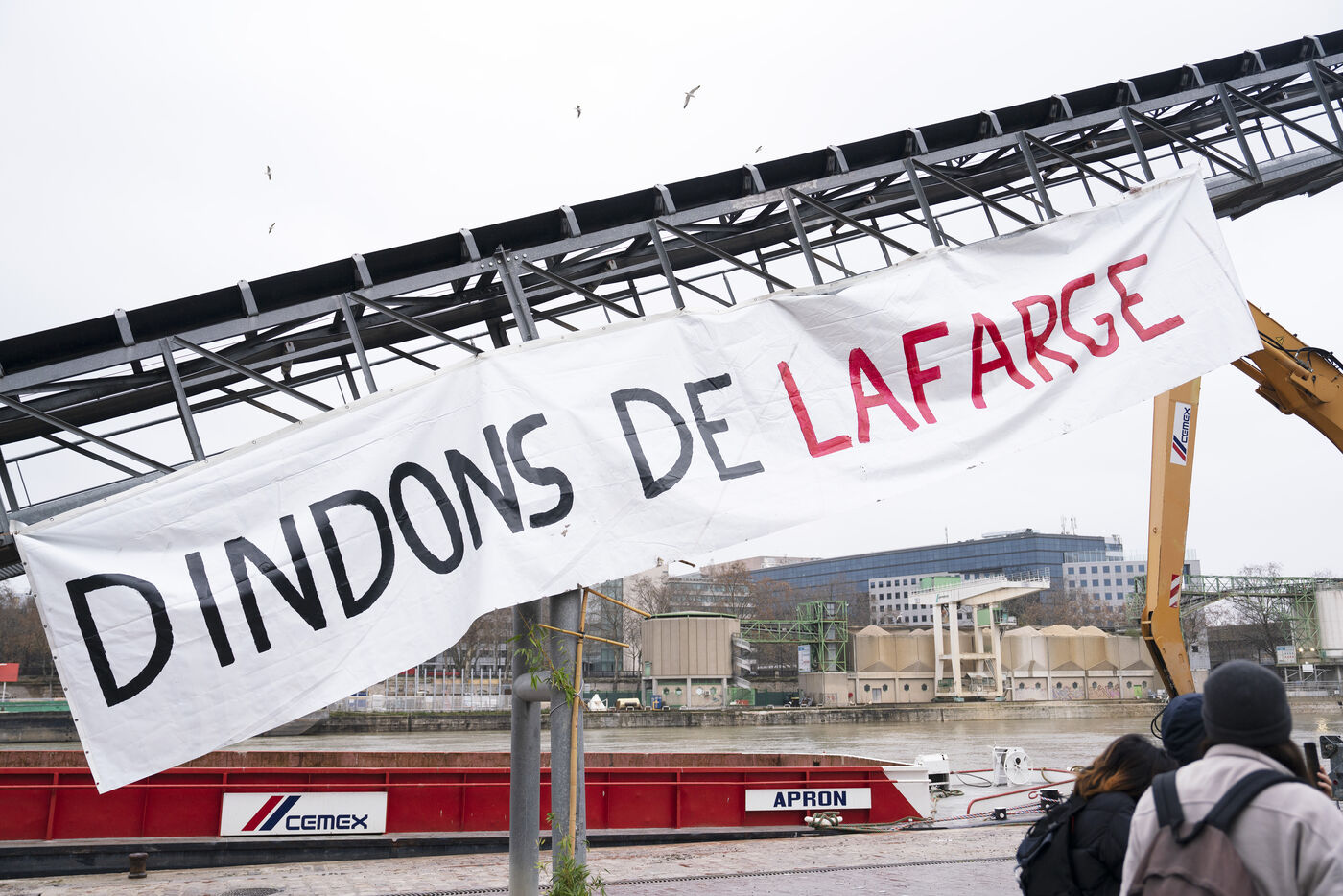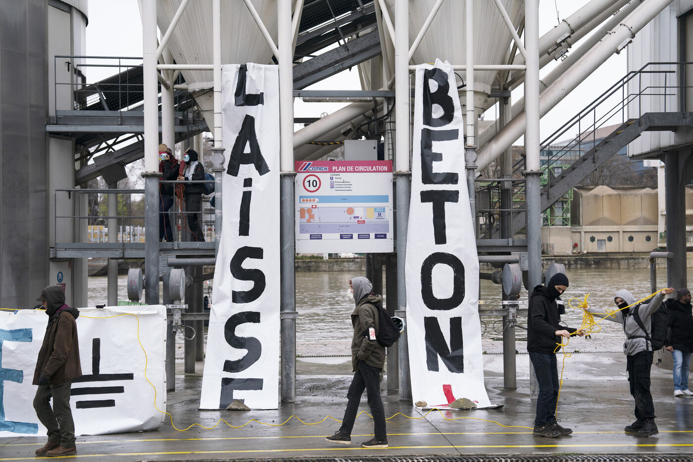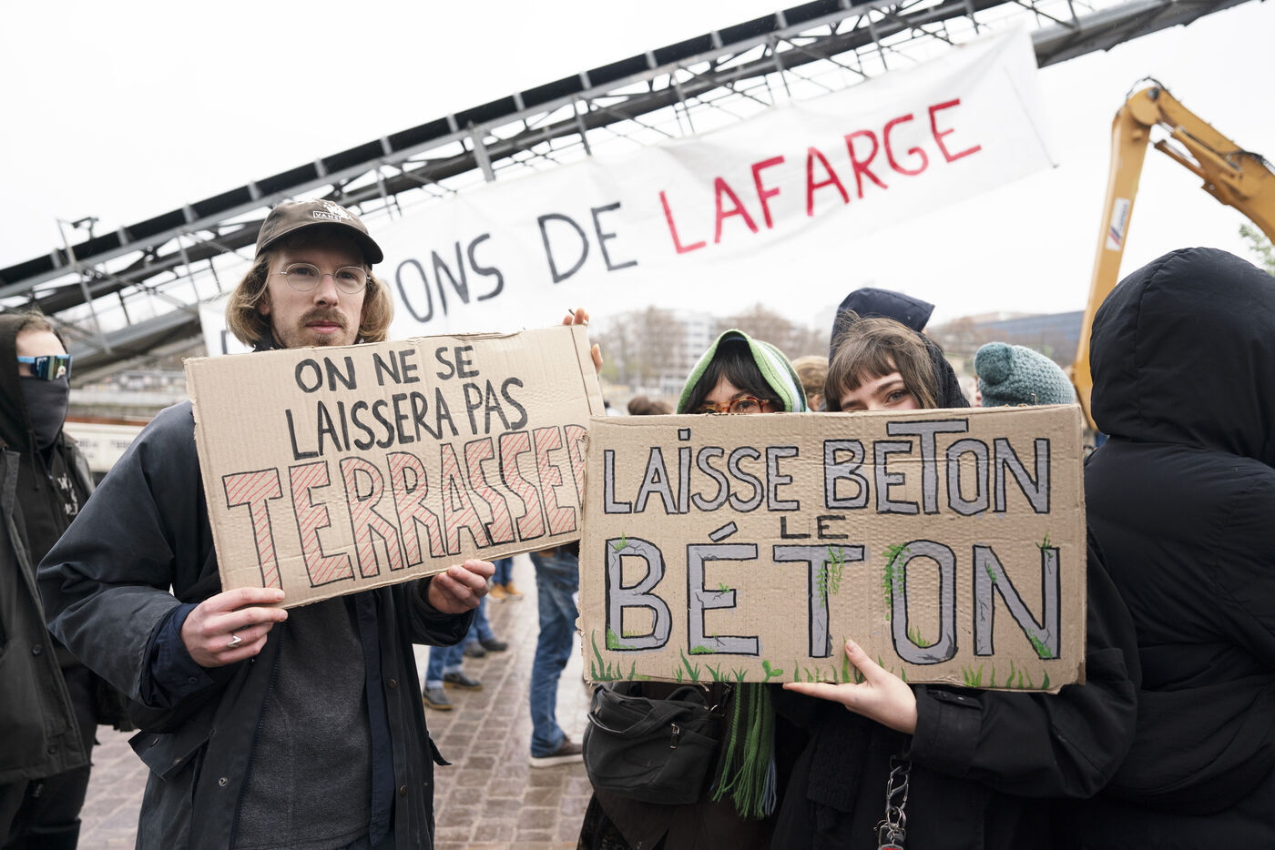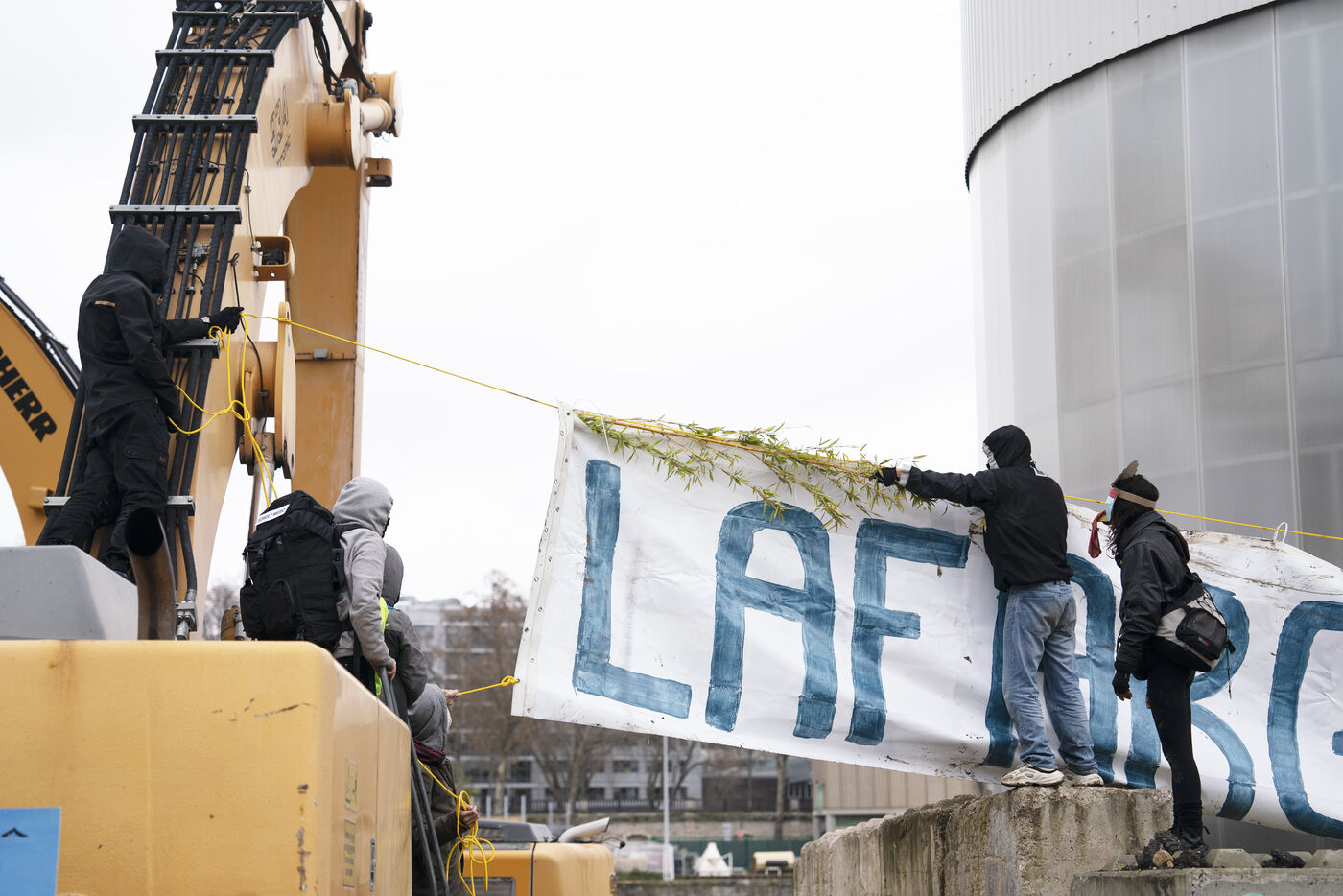 Rassemblement sur les quais de Seine en face des locaux de Lafarge à Bercy pour une action d'occupation dans le cadre des Journées de mobilisation contre le béton dans toute la France. L'action Kermesse Des Terres à l'initiative des Soulèvements de la terre, Attac, Extinction rébellion, Youth for climate notamment a pris la formes d'une occupation, de discours et de concerts. Dimanche 10 décembre 2023, à Paris.