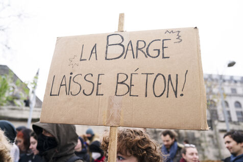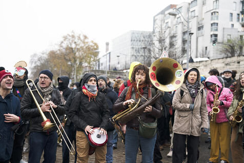 Gathering on the banks of the Seine opposite Lafarge's premises in Bercy for an occupation action as part of the Days of mobilization against concrete throughout France. The Kermesse Des Terres action, initiated by Soulèvements de la terre, Attac, Extinction rébellion and Youth for climate, took the form of an occupation, speeches and concerts. Sunday, December 10, 2023, Paris.