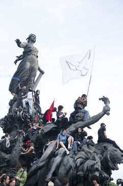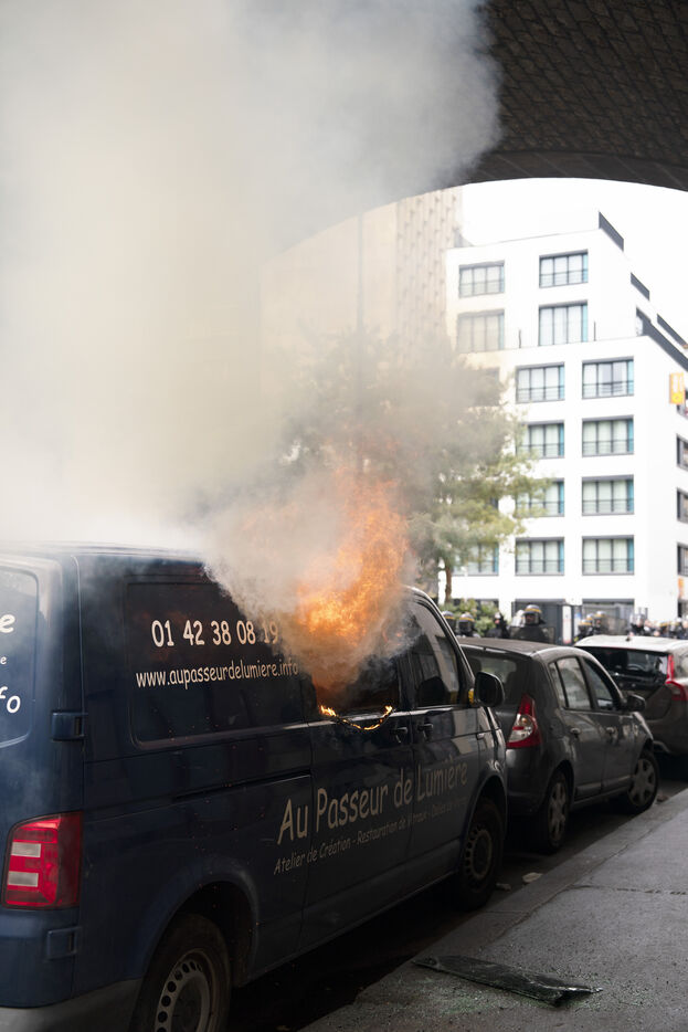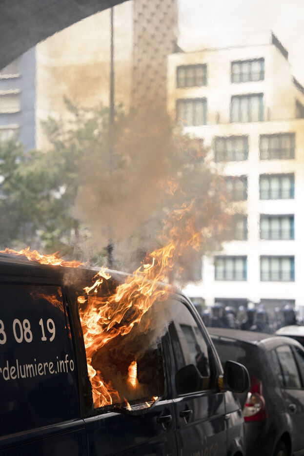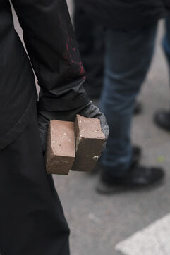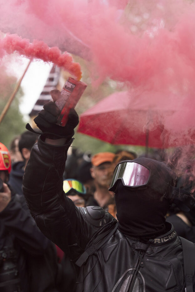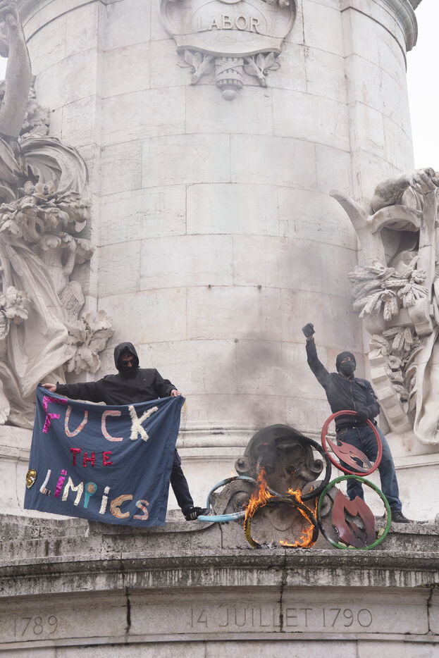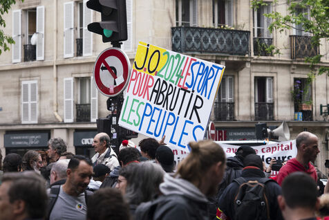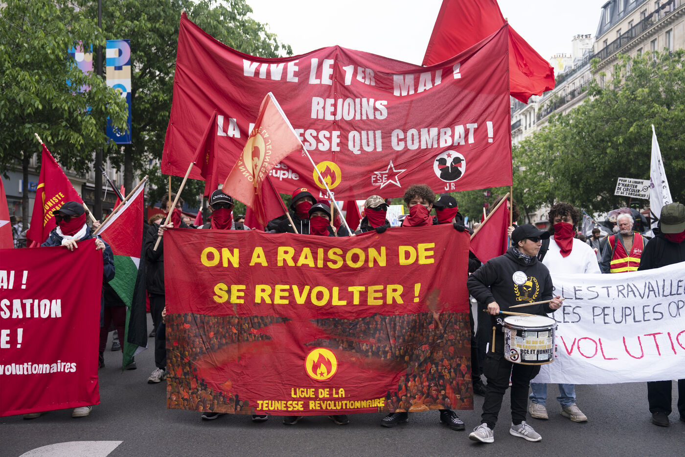 Manifestation du 1er mai 2024 pour les travailleurs et la justice sociale à Paris. Les manifestants dénonçaient notamment les JO de Paris 2024 et manifestaient pour les droits sociaux. Quelques affrontements ont eu lieu avec les forces de l'ordre. Entre Place de la République et Nation, le 1er mai 2024, à Paris.