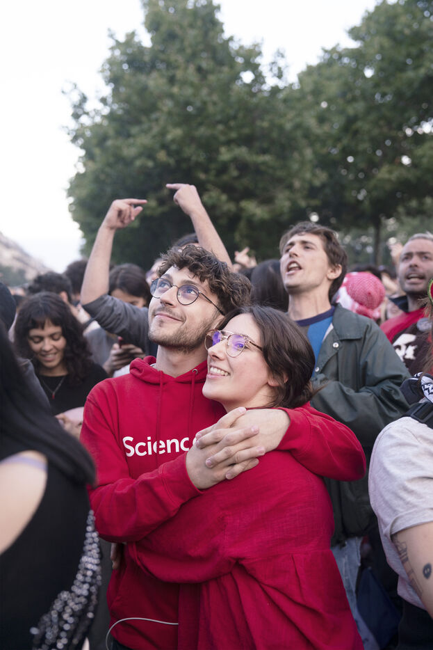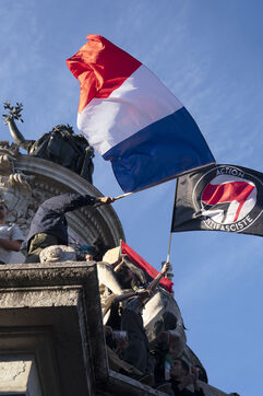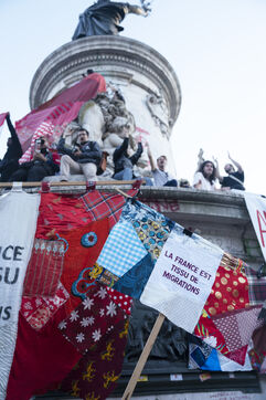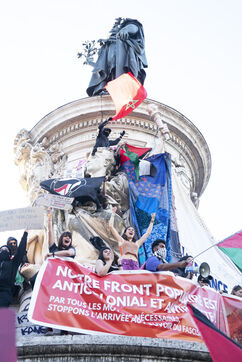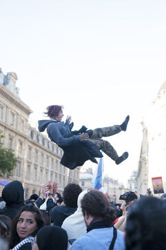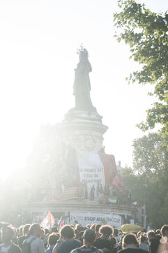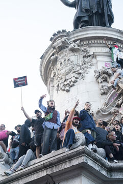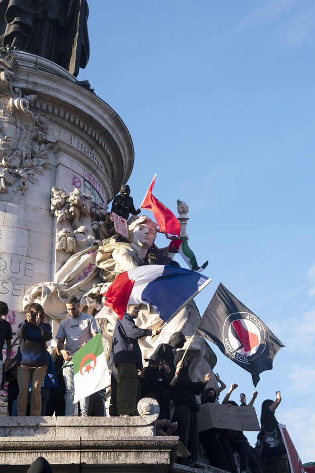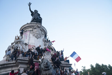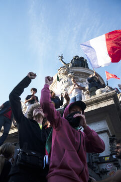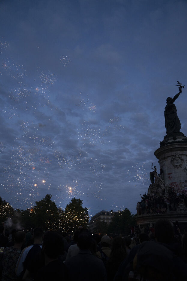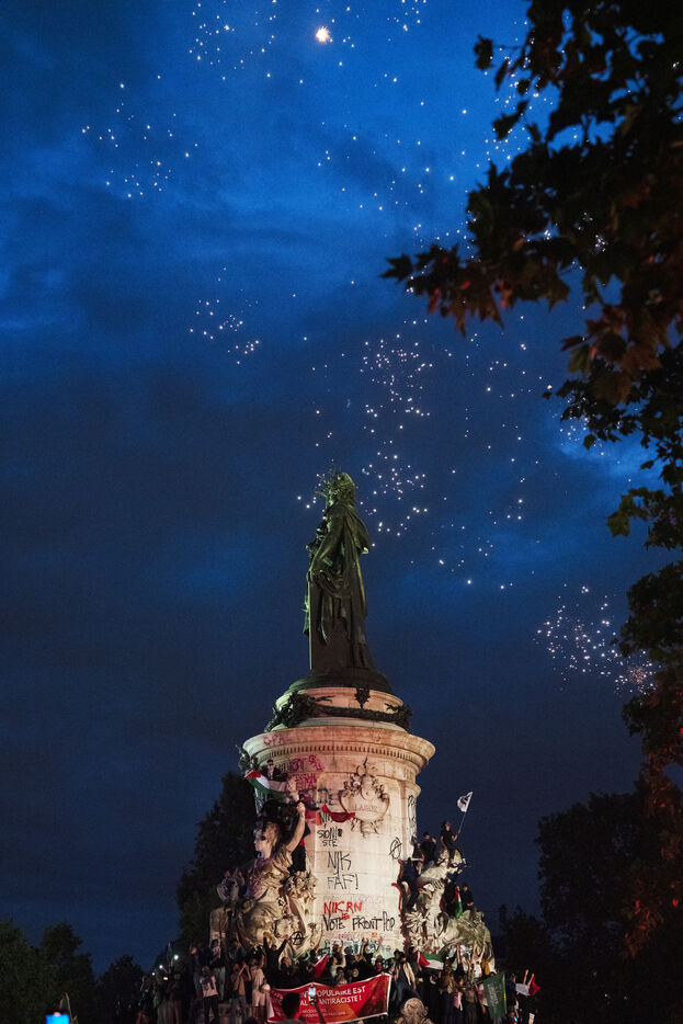 Gathering to celebrate the results of the Nouveau Front Populaire at the legislative elections in Paris. Left-wing supporters gathered on the Place de la République on July 7, 2024, to celebrate their relief at the results of the legislative elections, which had projected the far-right in the lead but ended up coming in third.