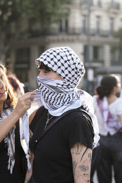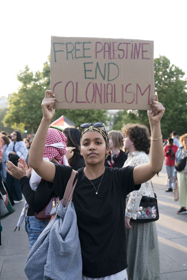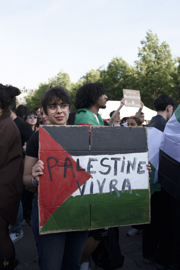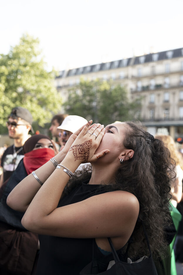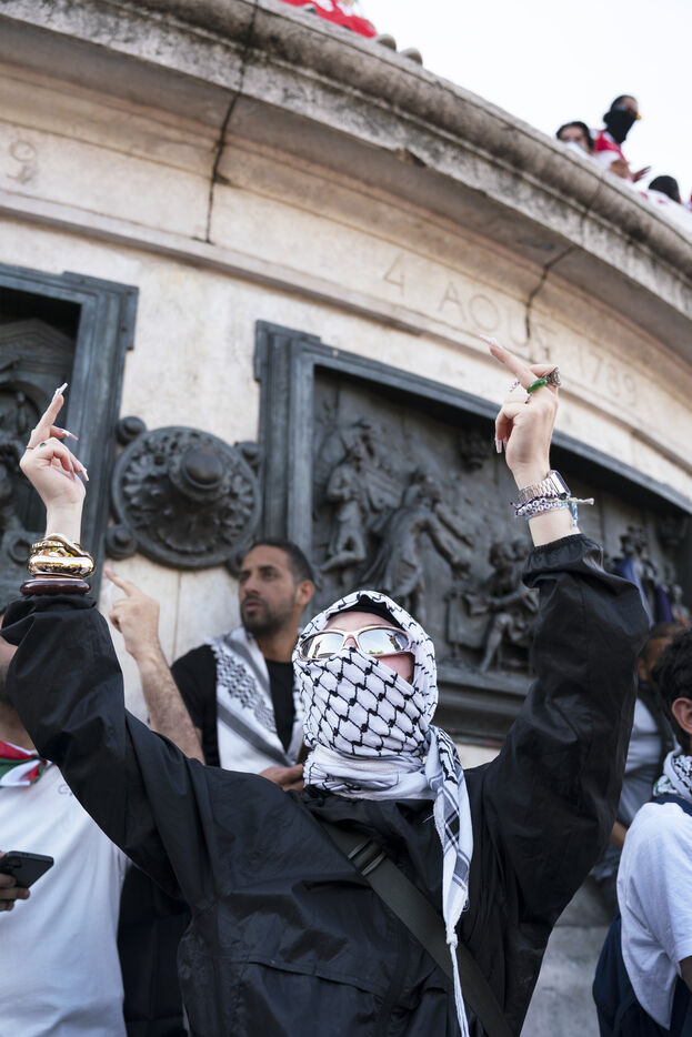 Second evening of rally and occupation in support of the Freedom Flotilla, Place de la République, Paris. The boat carrying 12 pro-Palestinian activists denouncing Israel's humanitarian blockade of the Gaza Strip was spotted and intercepted in waters near Gaza the day before, and the activists have been unable to communicate with the outside world since. Among the 12 activists on board were several French nationals, including MEP Rima Hassan, as well as the young Swedish woman Greta Thunberg. They are activists, humanitarians, journalists and doctors, French, German, Brazilian, Turkish, Swedish, Spanish and Dutch, who left Italy on June 1 to break the Israeli blockade of Gaza. June 10, 2025.