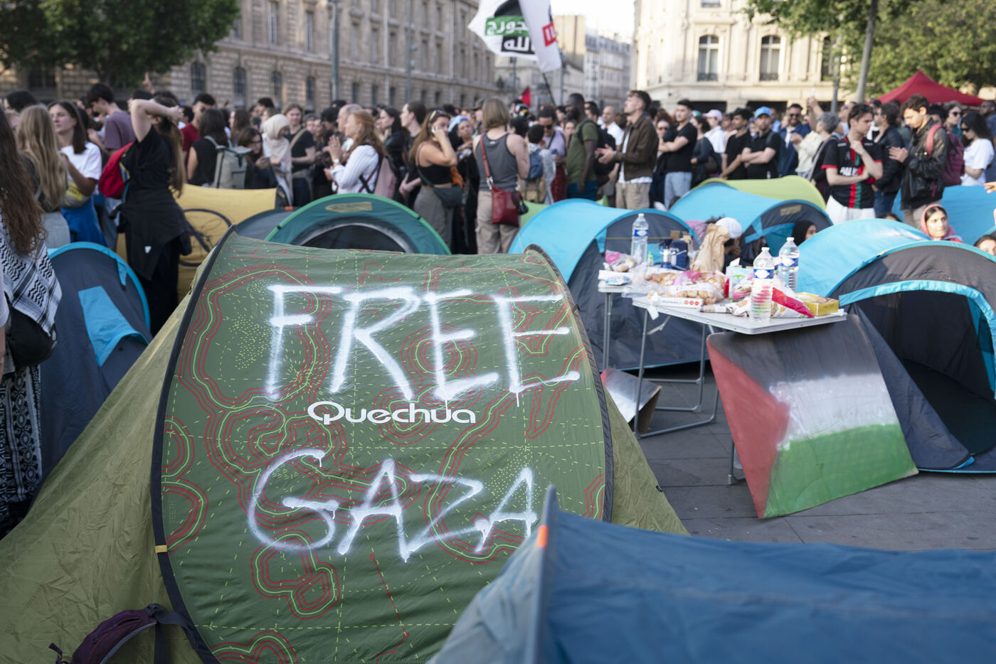 Deuxième soirée de rassemblement et d'occupation en soutien à la Flotille de la liberté, Place de la République, à Paris. Le bateau transportant 12 militants propalestiniens qui dénoncent le blocus humanitaire d'Israël dans la bande Gaza a été repéré et intercepté dans les eaux proches de Gaza la veille, les militants n'ont plus pu communiquer avec l'extérieur depuis. Le bateau comptait parmi les 12 militants plusieurs français dont l'eurodéputée Rima Hassan, mais aussi la jeune suédoise Greta Thunberg. Ils sont militants, humanitaires, journalistes et médecins, français, allemand, brésilien, turc, suédois, espagnol et néerlandais, partis d'Italie le 1er juin pour briser le blocus israélien à Gaza. Le 10 juin 2025.