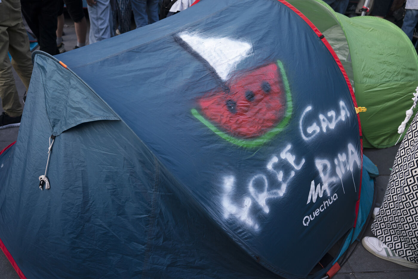 Troisième soirée de rassemblement et d'occupation en soutien à la Flotille de la liberté, Place de la République, à Paris. Le bateau transportant 12 militants propalestiniens qui dénoncent le blocus humanitaire d'Israël dans la bande Gaza a été repéré et intercepté dans les eaux proches de Gaza la veille, les militants n'ont plus pu communiquer avec l'extérieur depuis. Le bateau comptait parmi les 12 militants plusieurs français dont l'eurodéputée Rima Hassan, mais aussi la jeune suédoise Greta Thunberg. Ils sont militants, humanitaires, journalistes et médecins, français, allemand, brésilien, turc, suédois, espagnol et néerlandais, partis d'Italie le 1er juin pour briser le blocus israélien à Gaza. Le 11 juin 2025.