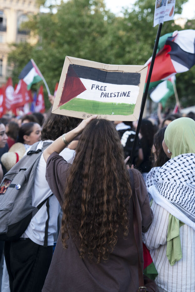 Retour de Rima Hassan à Paris, Place de la République, après sa détention par Israël à la suite de l'interception de la Flotille de la liberté. Le bateau transportant 12 militants propalestiniens qui dénoncaient le blocus humanitaire d'Israël dans la bande Gaza avait été repéré et intercepté dans les eaux proches de Gaza.