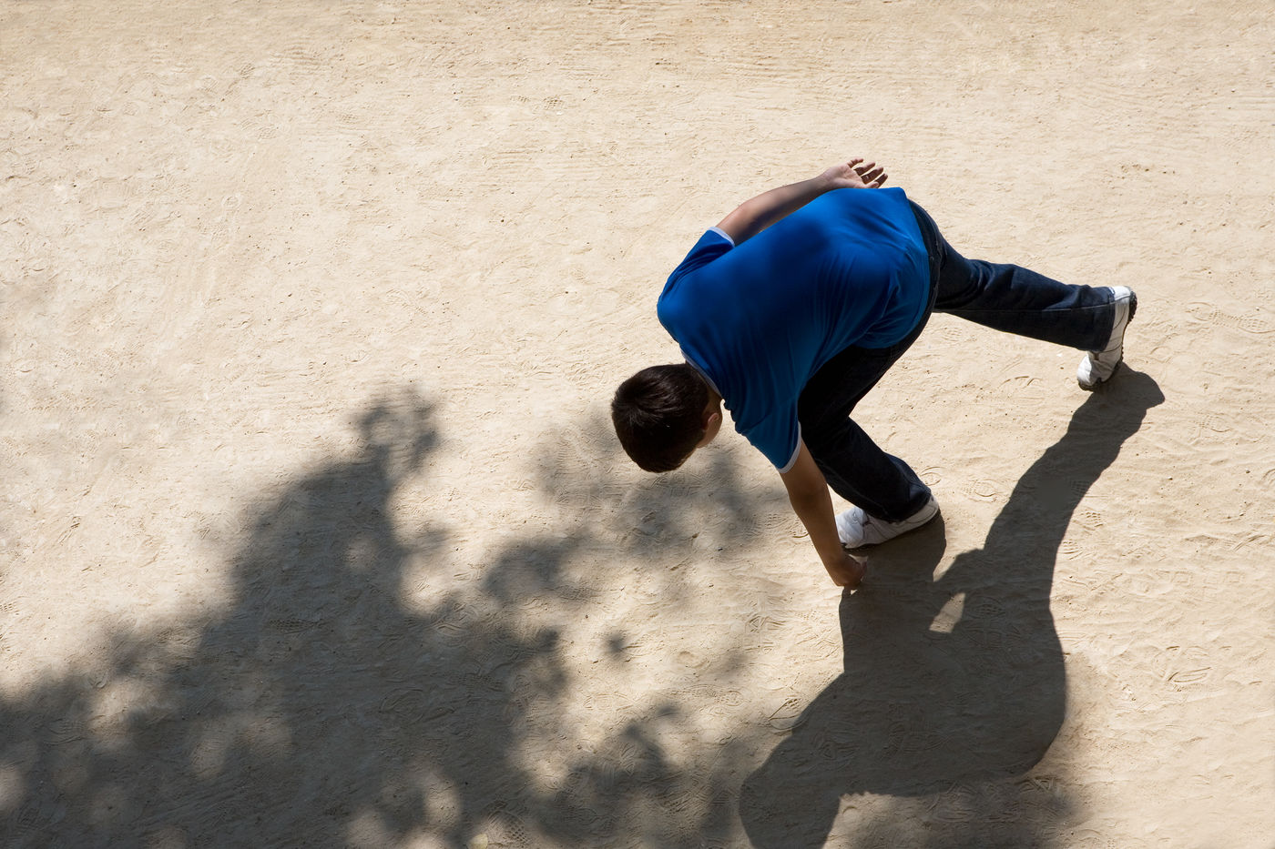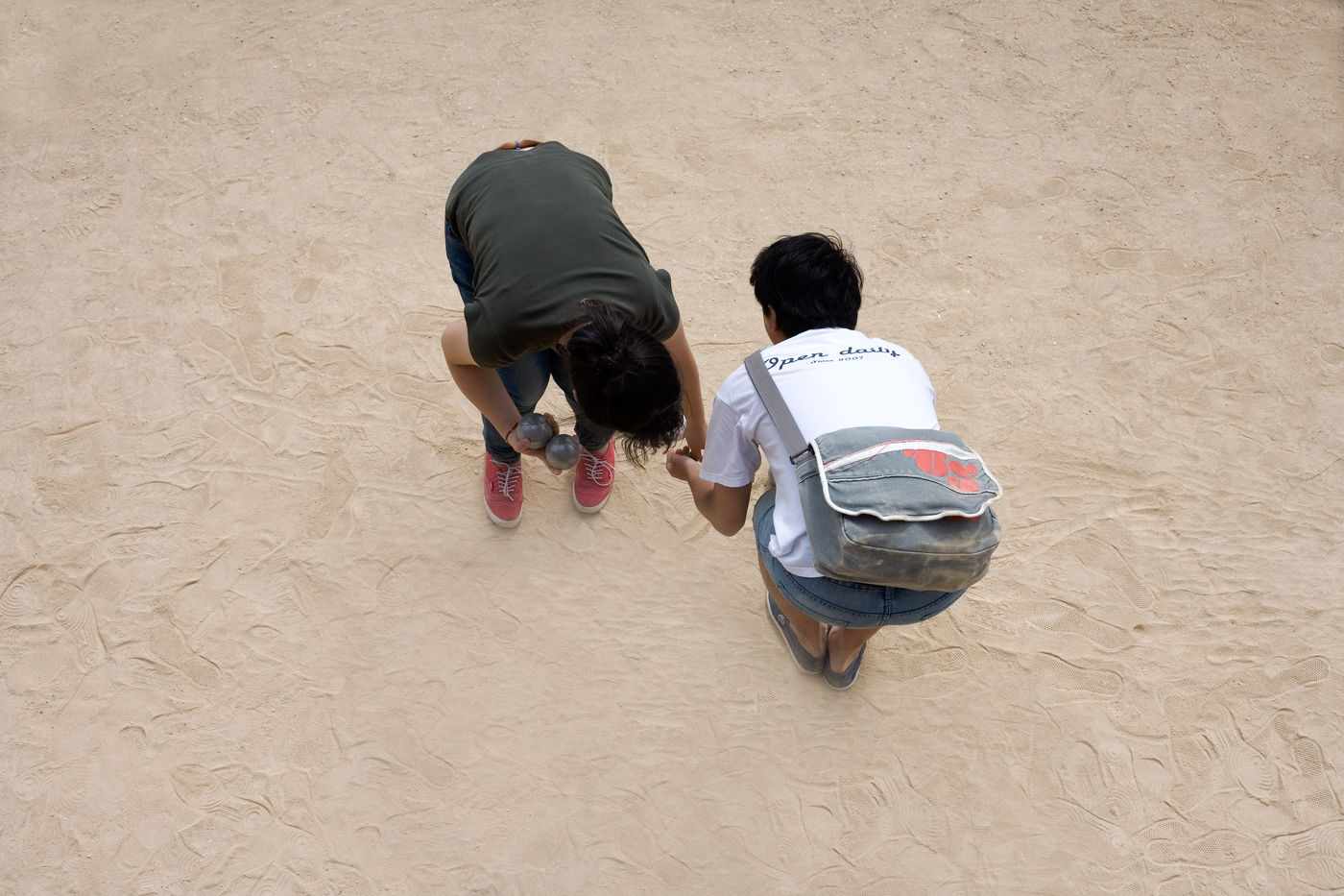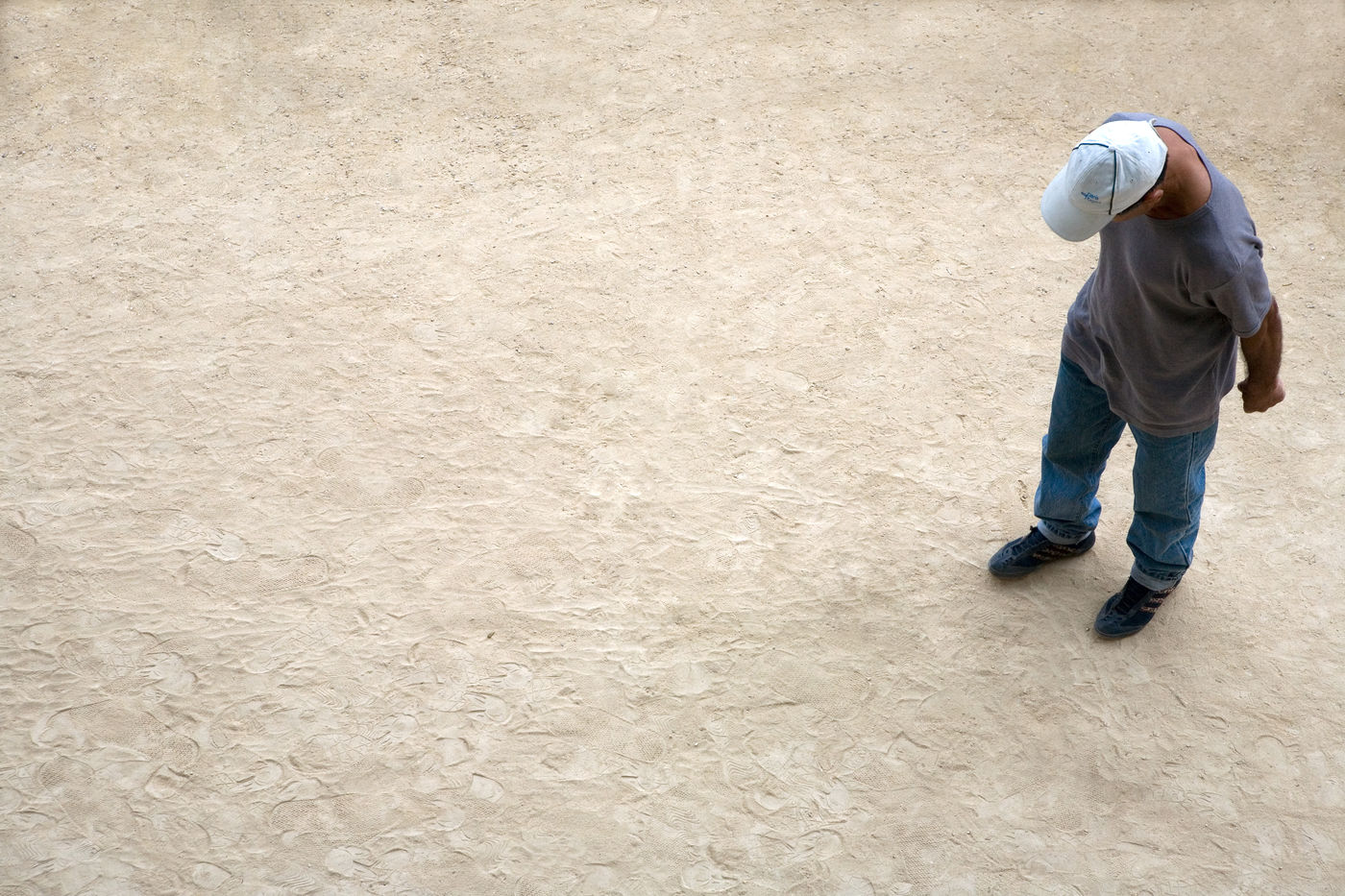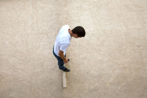 In these photographs of petanque players, the photographer dispossessed the players of the object at the centre of their action. All that remains is the stopped movement, the gesture, the attitude. The persons taken from a bird's eye view look like specimens of insects or butterflies pinned on a board in a museum window.
