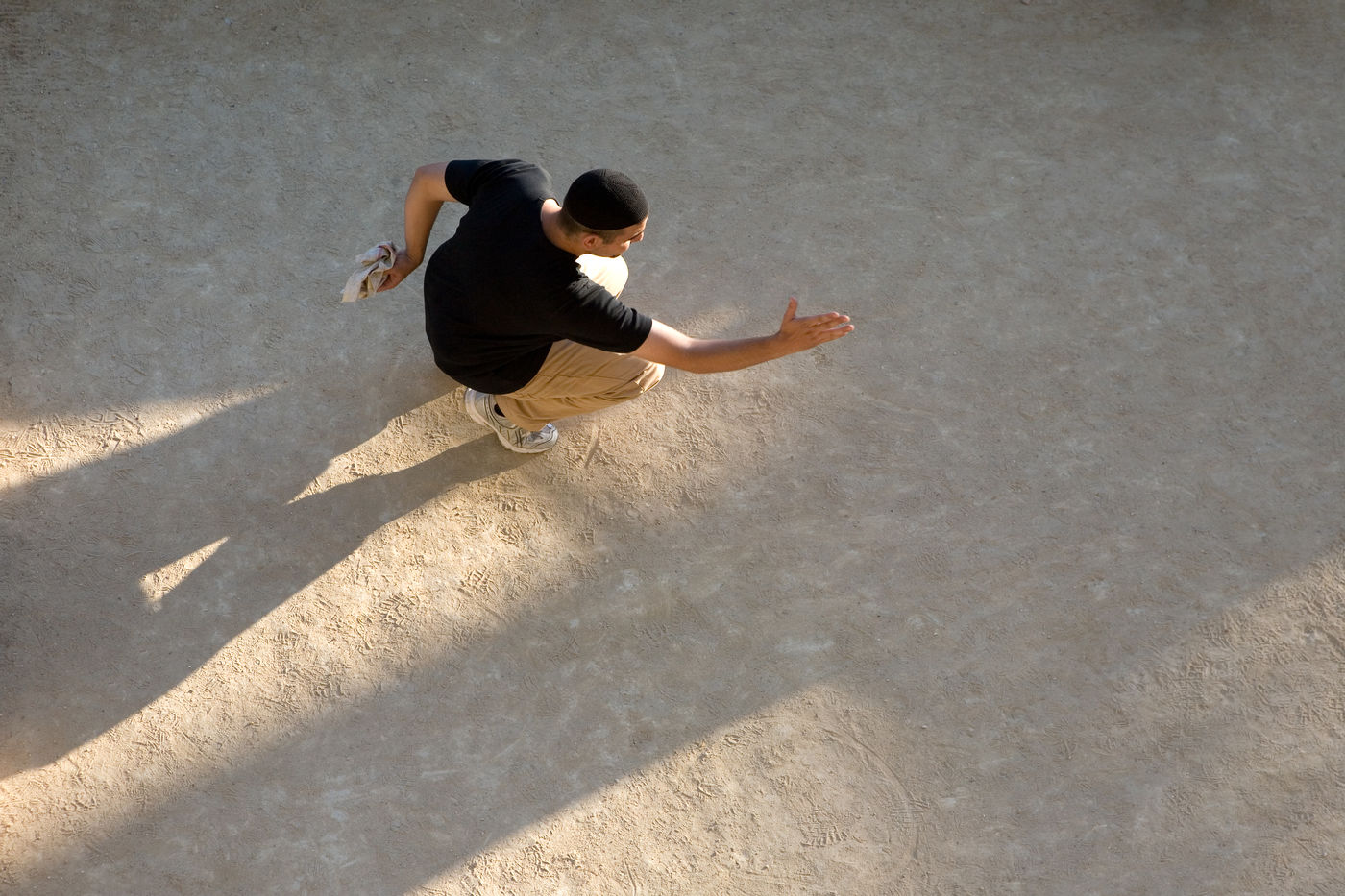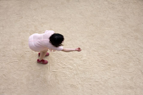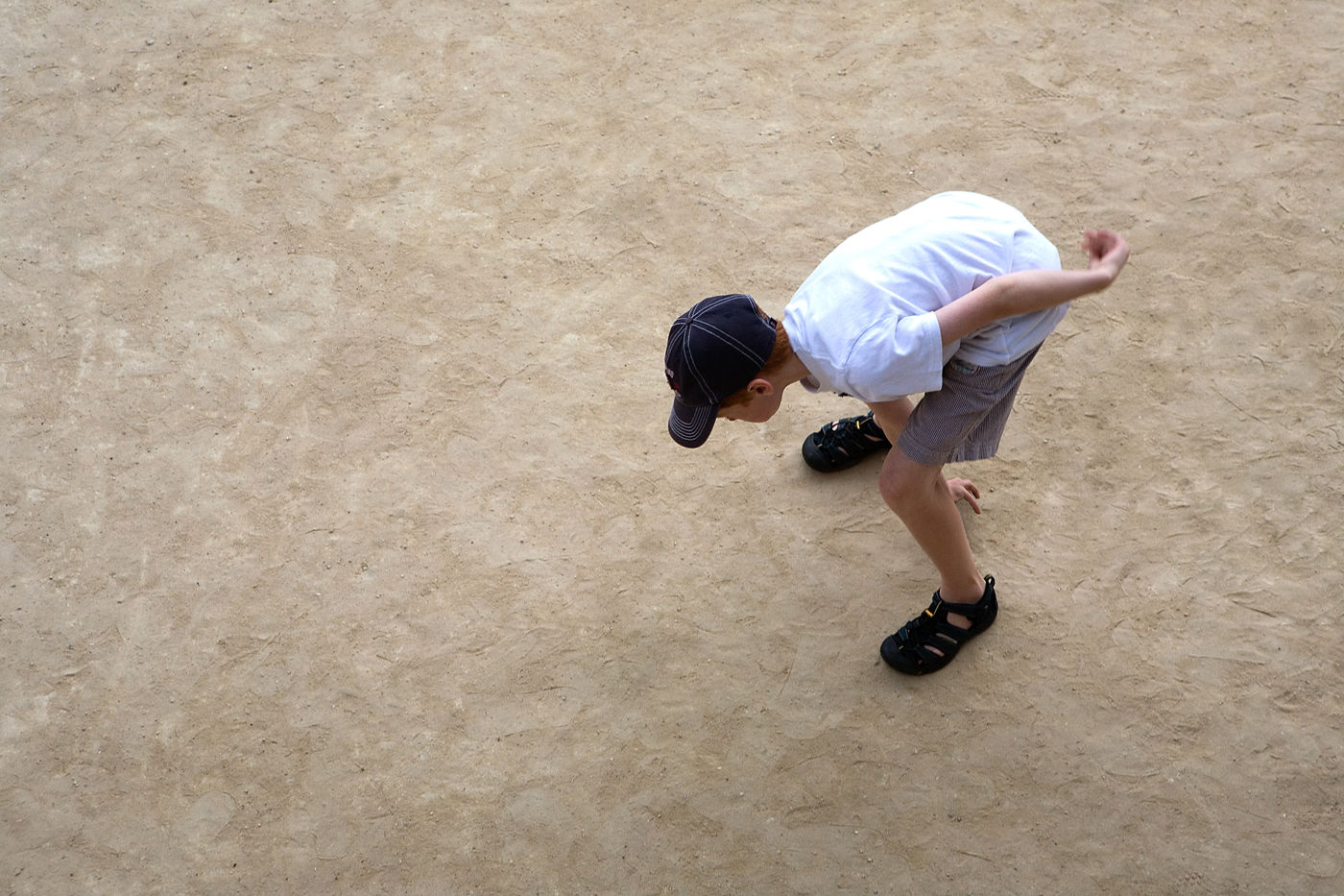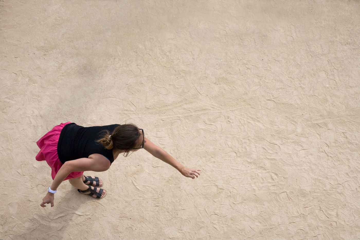 In these photographs of petanque players, the photographer dispossessed the players of the object at the centre of their action. All that remains is the stopped movement, the gesture, the attitude. The persons taken from a bird's eye view look like specimens of insects or butterflies pinned on a board in a museum window.