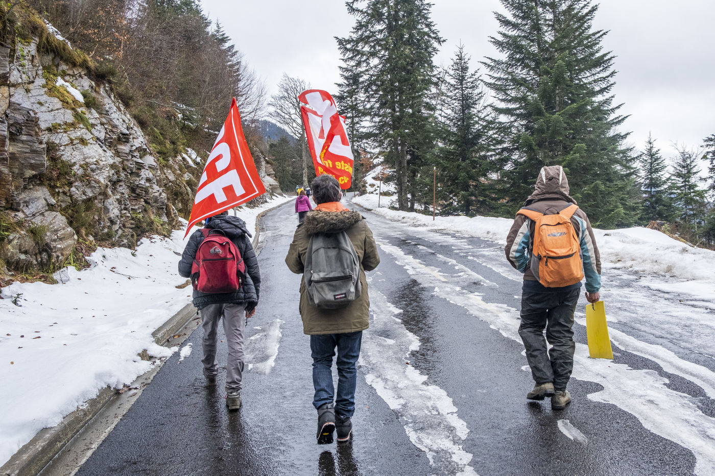 In the Pyrenees, above Luchon, demonstration against the occupation of the Portillon pass last week by the extreme right-wing group Génération identitaire. The latter claiming to fight against the invasion of migrants. The demonstration organised by various political parties and human rights associations brought together about a hundred people who came to protest against the extreme right's coup de force. This had provoked a wave of protests among political representatives and led the Minister of the Interior to consider the dissolution of the group. Stickers still in place bear witness to the action of the extremist movement.