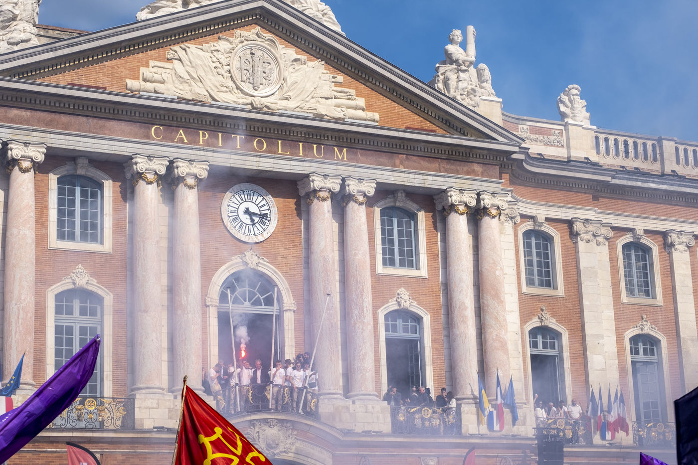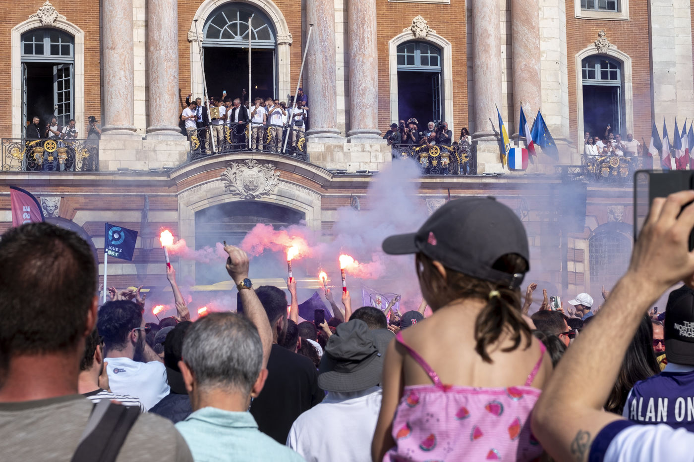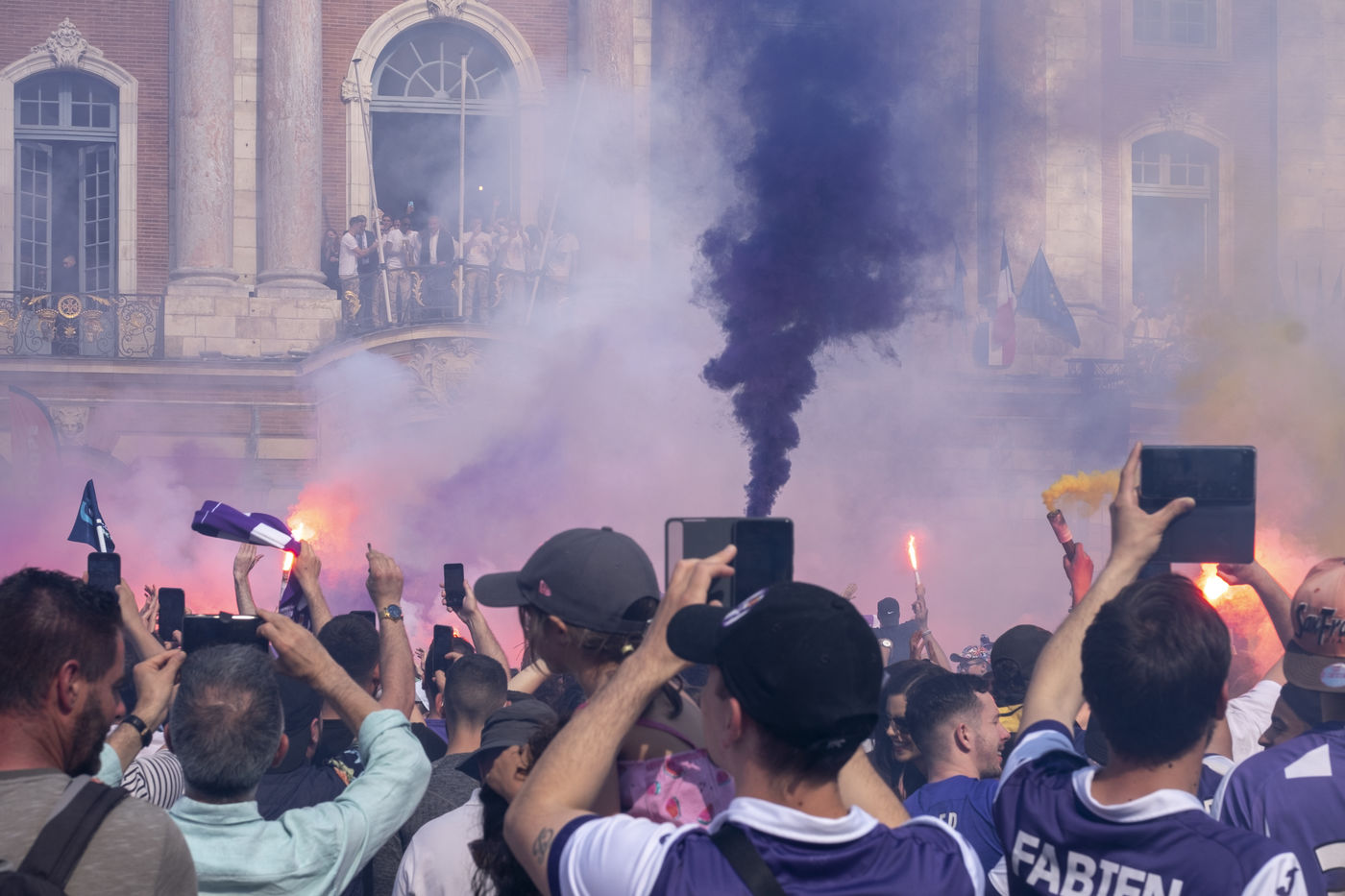 Les supporters du Toulouse football club se sont massés sur la place du Capitole pour fêter la victoire de leur équipe en championnats de France de ligue 2. Ils joueront la prochaine saison en ligue 1.