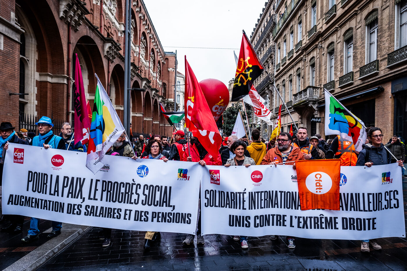 Plusieurs milliers de manifestants se sont regroupés à Toulouse à l'occasion du traditionnel défilé du 1er mai. Au-delà des revendications syndicales pour l'emploi, les salaires ou contre l'austérité, de nombreux manifestants ont aussi exprimé leur soutien à la Palestine.