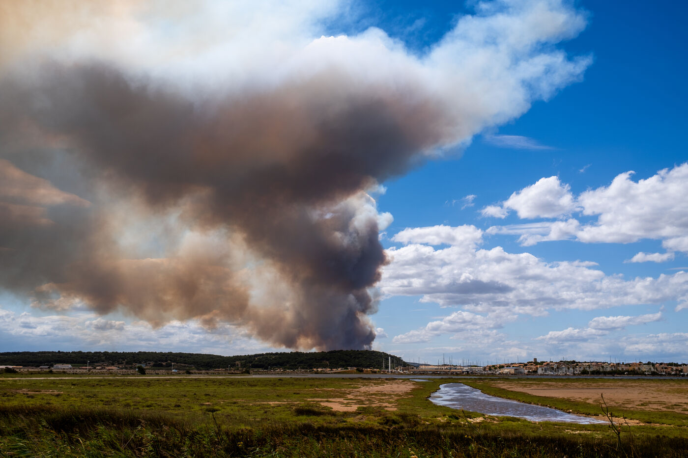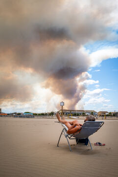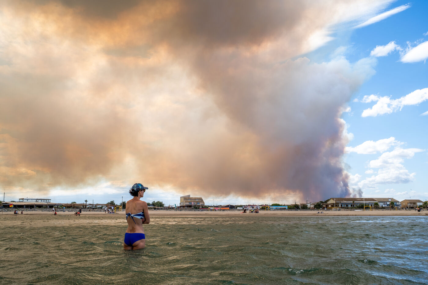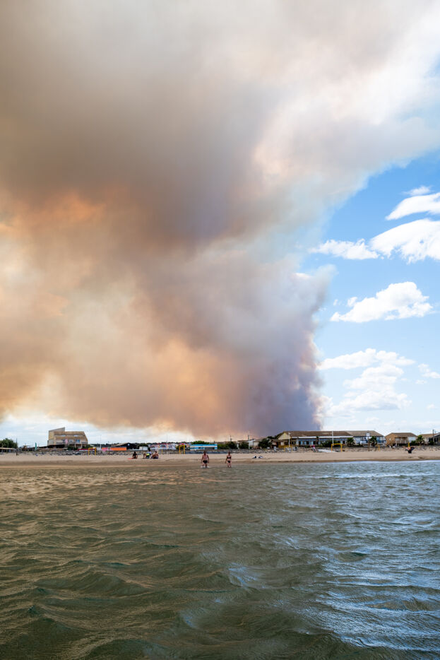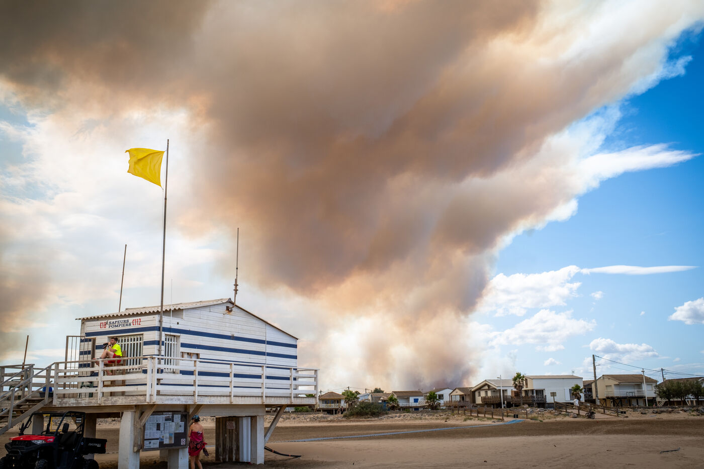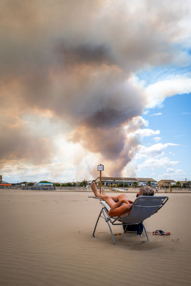 With severe drought conditions and strong winds blowing for several days, forest fires are breaking out daily in the Aude department. Here, the plume of smoke from the Bizanet fire casts a shadow over holidaymakers on Gruissan beach.