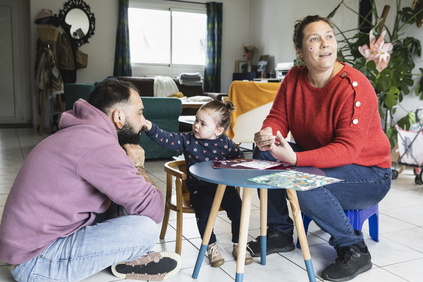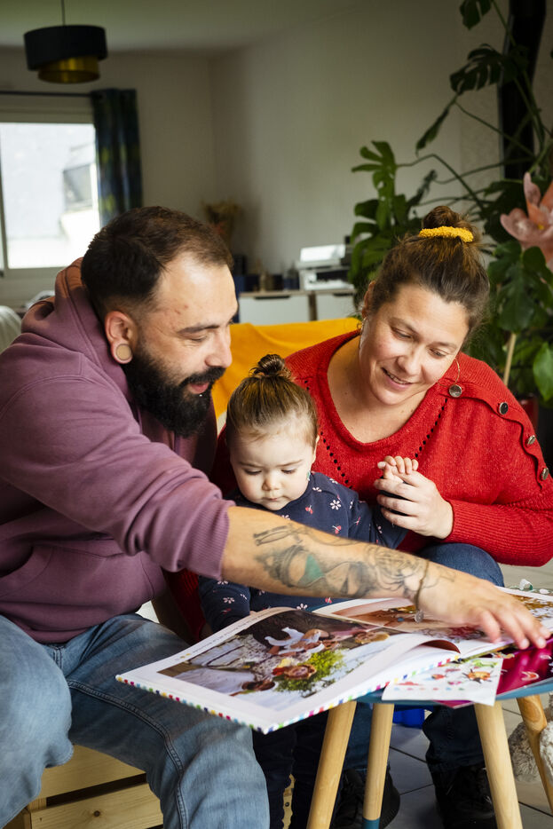 Portrait de Delphine, Alexis et de leur fille. Delphine est hétérosexuelle et alexis homosexuel. Ils ont décidé de faire un enfant et de l'élever ensemble en co-parentalité.