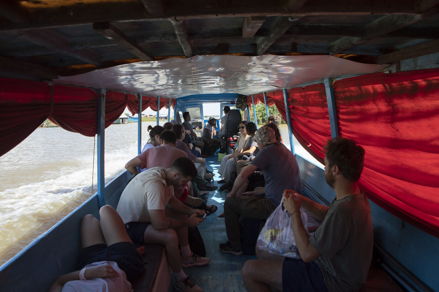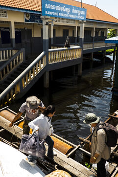 Durant la saison des pluies, entre Battambang et Siem Reap, un petit bateau taxi de la compagnie Angkor Express Boat, fondée par des cambodgiens, effectue le transport de passagers et le ravitaillement des villages flottants isolés sur la Sangker River.