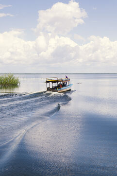 During the rainy season, between Battambang and Siem Reap, a small cab boat belonging to the Angkor Express Boat company, founded by Cambodians, carries passengers and supplies to isolated floating villages on the Sangker River.