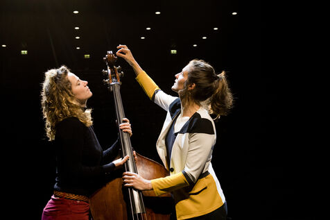 Portraits de Claire Laurent et Morgane Labbe . Claire (voix, écriture) et Morgane (voix, contrebasse, accordéon et composition) préparent leur nouveau spectacle : Dérive ( sortie octobre 2025). Un concert récit sur les traces d'Ulysse. Une grande épopée mythologique aux accents d'aujourd'hui on l'on croise les personnages écorchés de l'Odyssée.