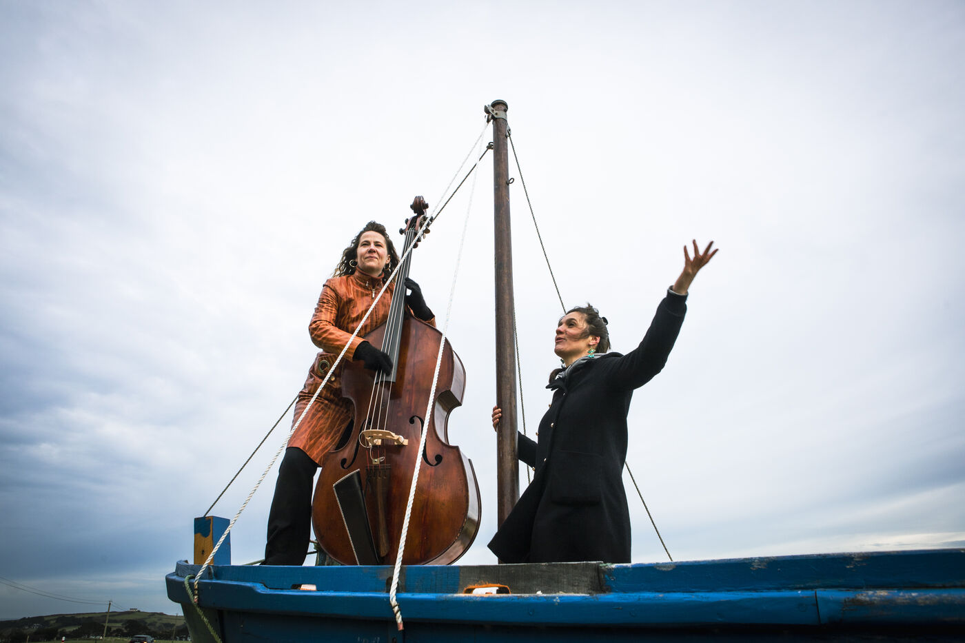 Portraits of Claire Laurent (vocals, writing) and Morgane Labbe (vocals, double bass, accordion, and composition). They rehearse indoors and outdoors. On Guimorais Beach and in a theater in a in Brittany. Claire (vocals, songwriting) and Morgane (vocals, double bass, accordion, and composition) are preparing their new show: Dérive (to be released in October 2025). A concert-story following in the footsteps of Ulysses. A great mythological epic with modern accents, where we encounter the tormented characters of the Odyssey.