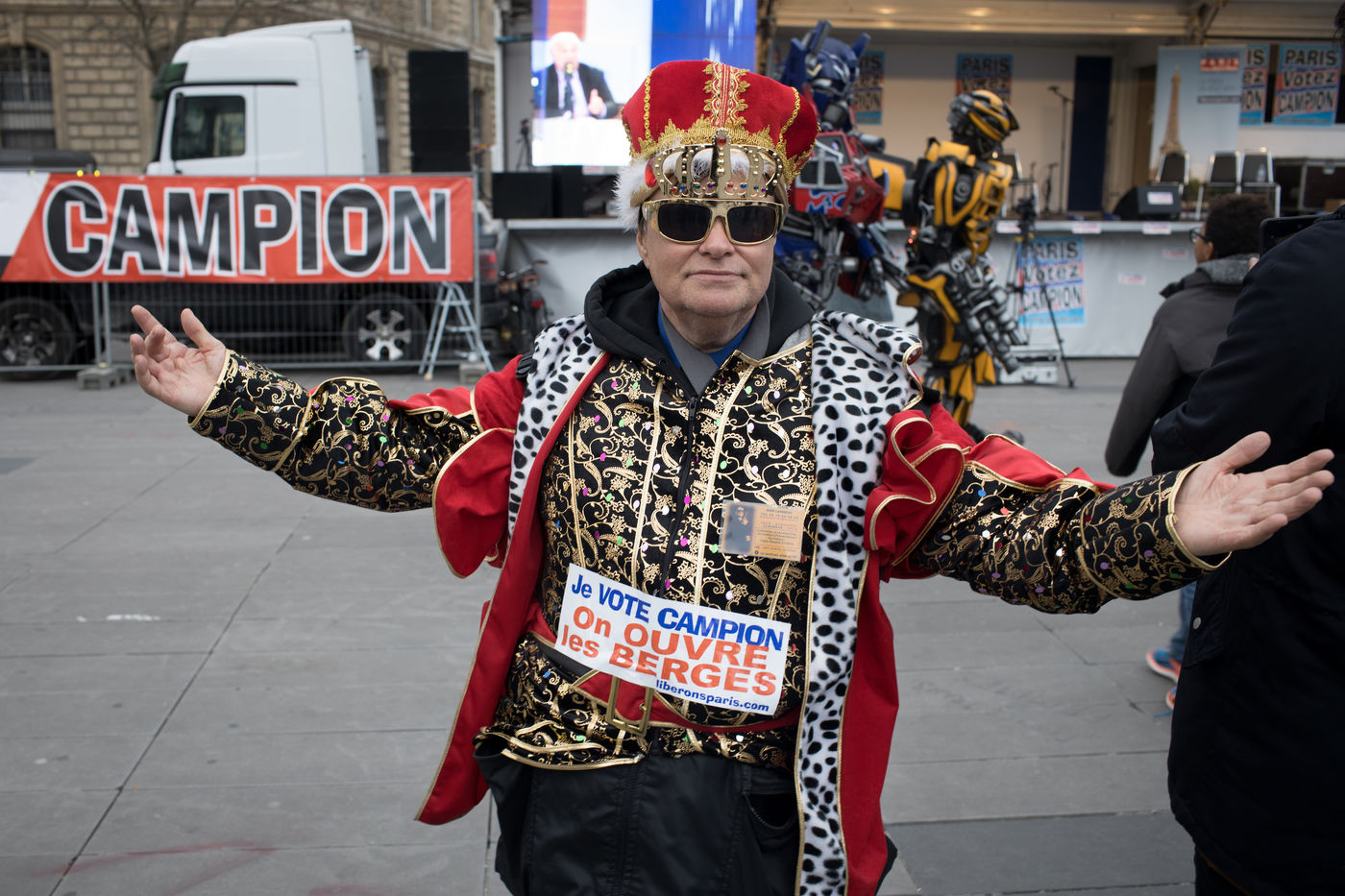 Paris mayoral candidate Bernard Campion held a meeting on the Place de la Republique on March 11, 2020. Promoter of reopening the banks of the Seine to traffic, the "King of fairgrounds" called on his supporters not to let go of their cars.