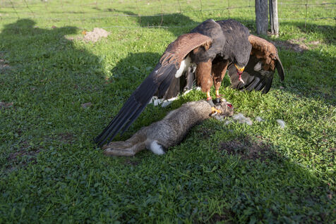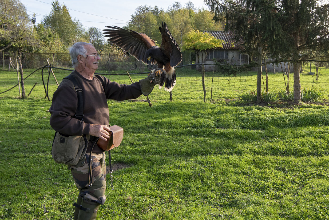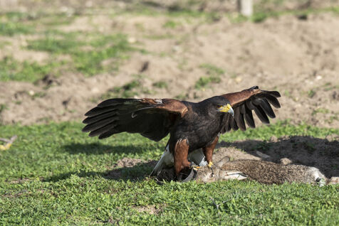 Falconers use Harris hawk and ferrets to hunt rabbits. Falconers intervene at the request of homeowners, often in areas close to dwellings where it is impossible to shoot rabbits. The ferrets are sent into the burrows to flush out the rabbits, which are then captured by the buzzards.