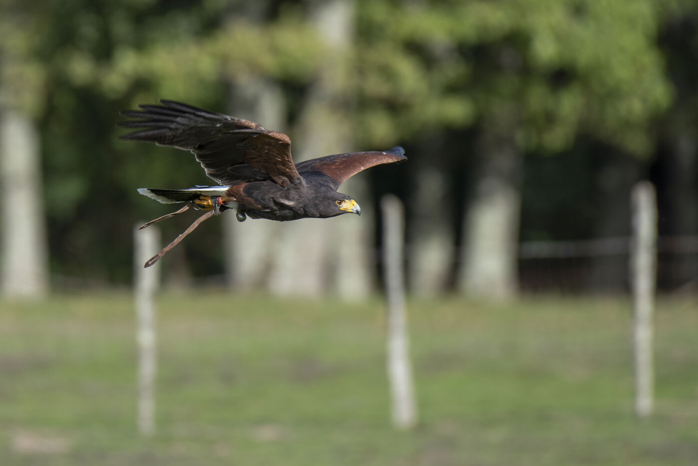 Les fauconniers utilisent des buses de Harris et des furets pour chasser les lapins. C'est à la demande des propriétaires que les fauconniers interviennent, dans des lieux souvent proches des habitations ou il est impossible de tirer les lapins au fusil. Les furets sont envoyés dans les terriers pour en faire sortir les lapins qui sont capturés par les buses.