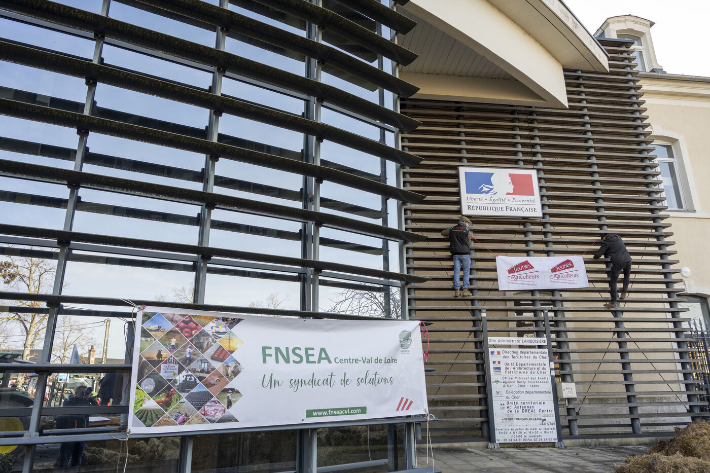 Les agriculteurs se sont réunis a l'appel de la FNSEA et des jeunes agriculteurs du Cher devant le batiment de la Direction Départementale des Territoires.
