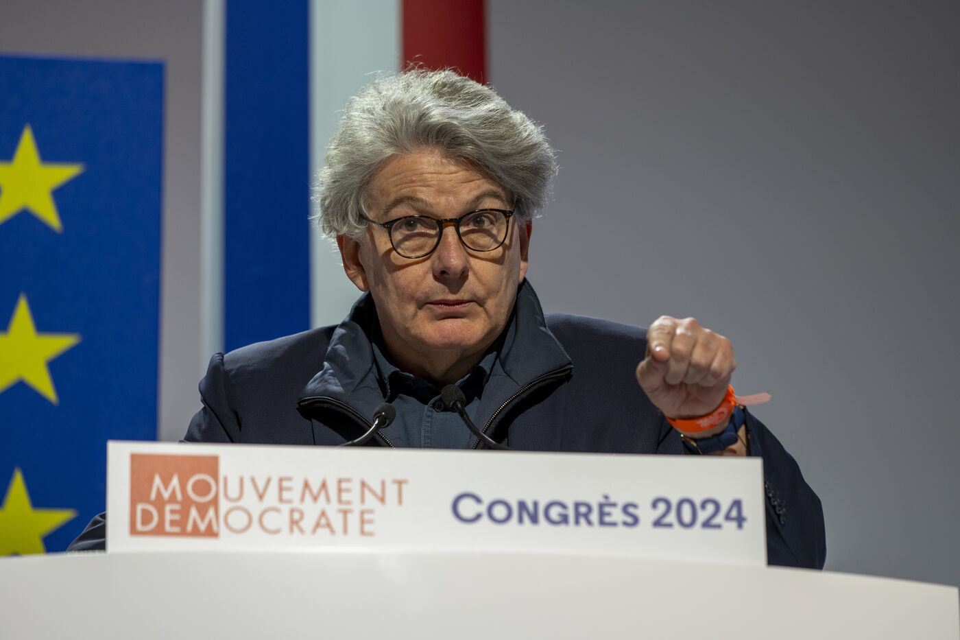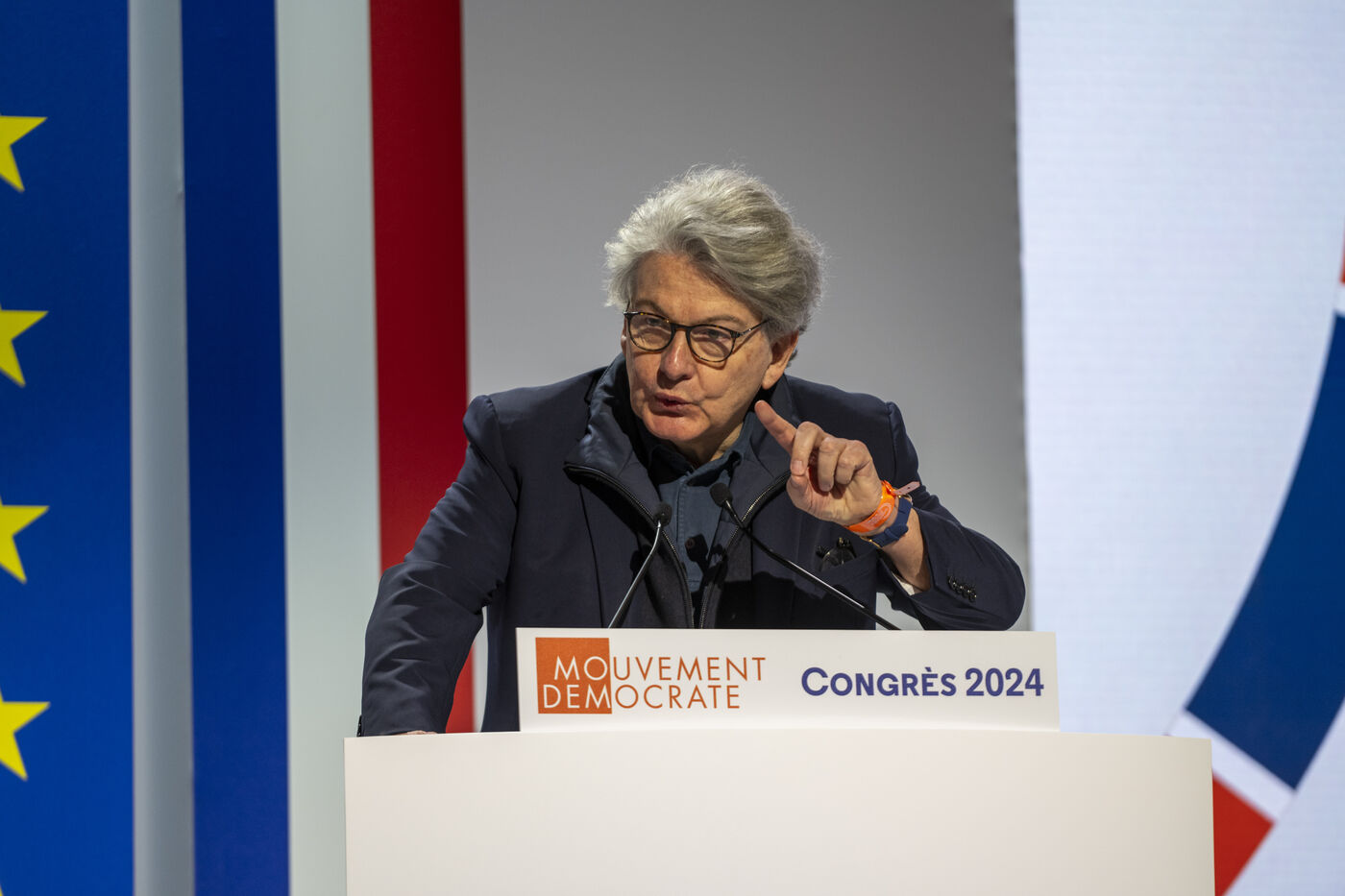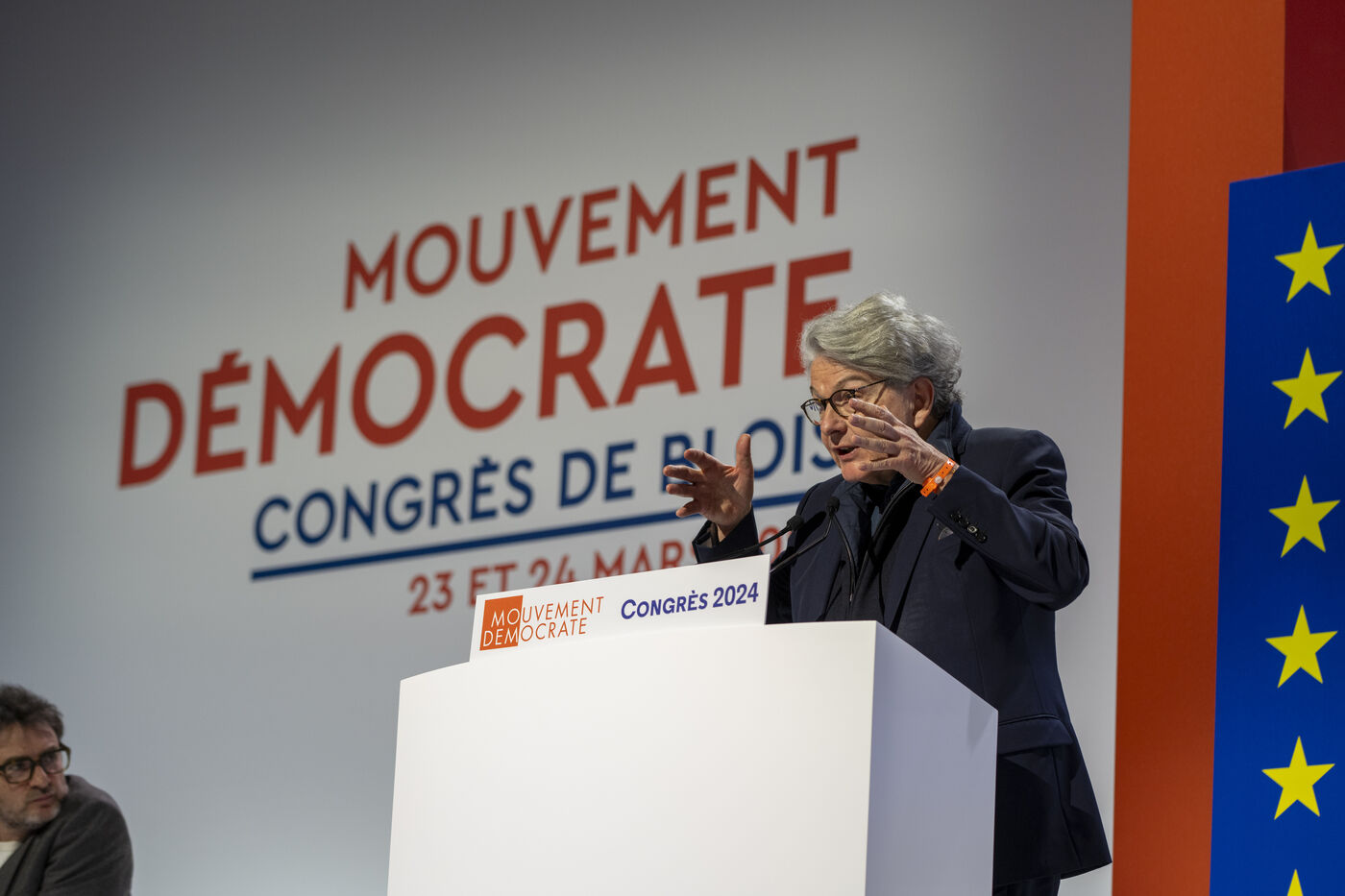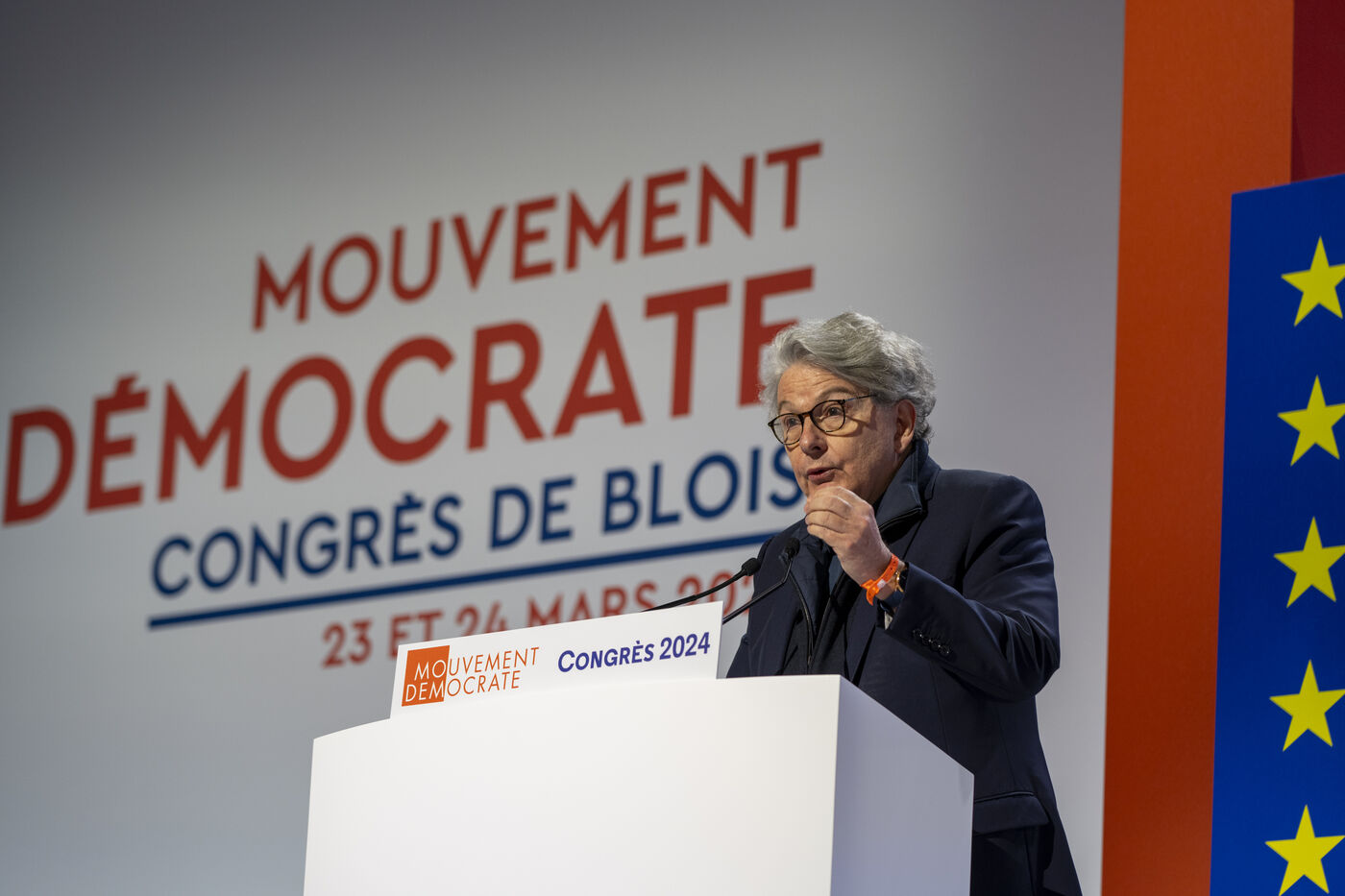 Thierry Breton, European Commissioner, and Sarah El Hairi, Minister Delegate for Children, attend the Modem Congress in Blois on 23 March 2024.